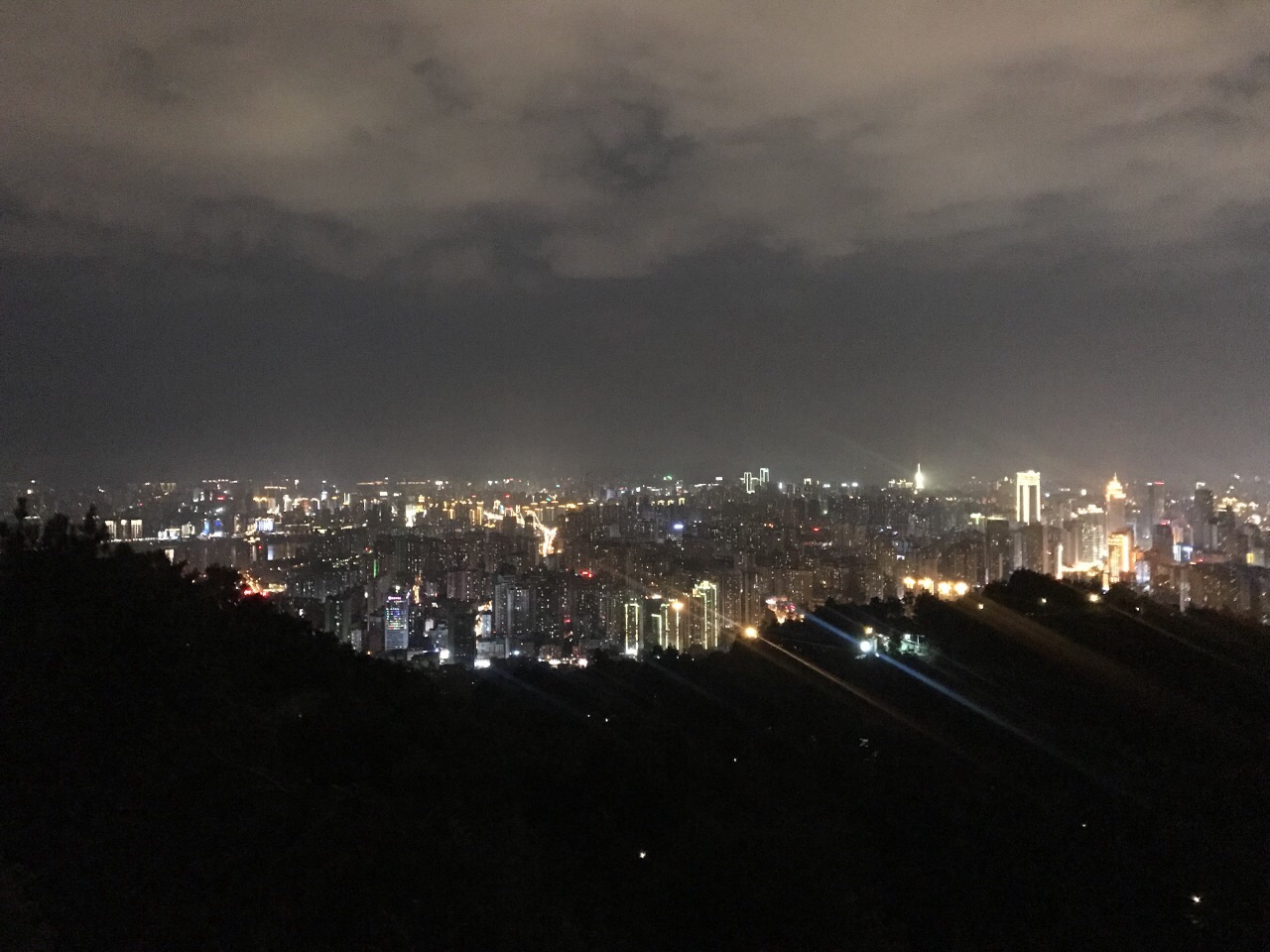 新开没多久,免费,还有一些地方没有完全建好,比如停车场还没开放。我们爬到问天石,这里有个平台可以俯瞰两江和重庆城区夜景,挺美的。不足之处是路灯很少,夜里爬山很黑,安全隐患比较大,既然定位为夜公园,这点需要改进。我们没继续往上爬,可能到更高的位置视野会更好。