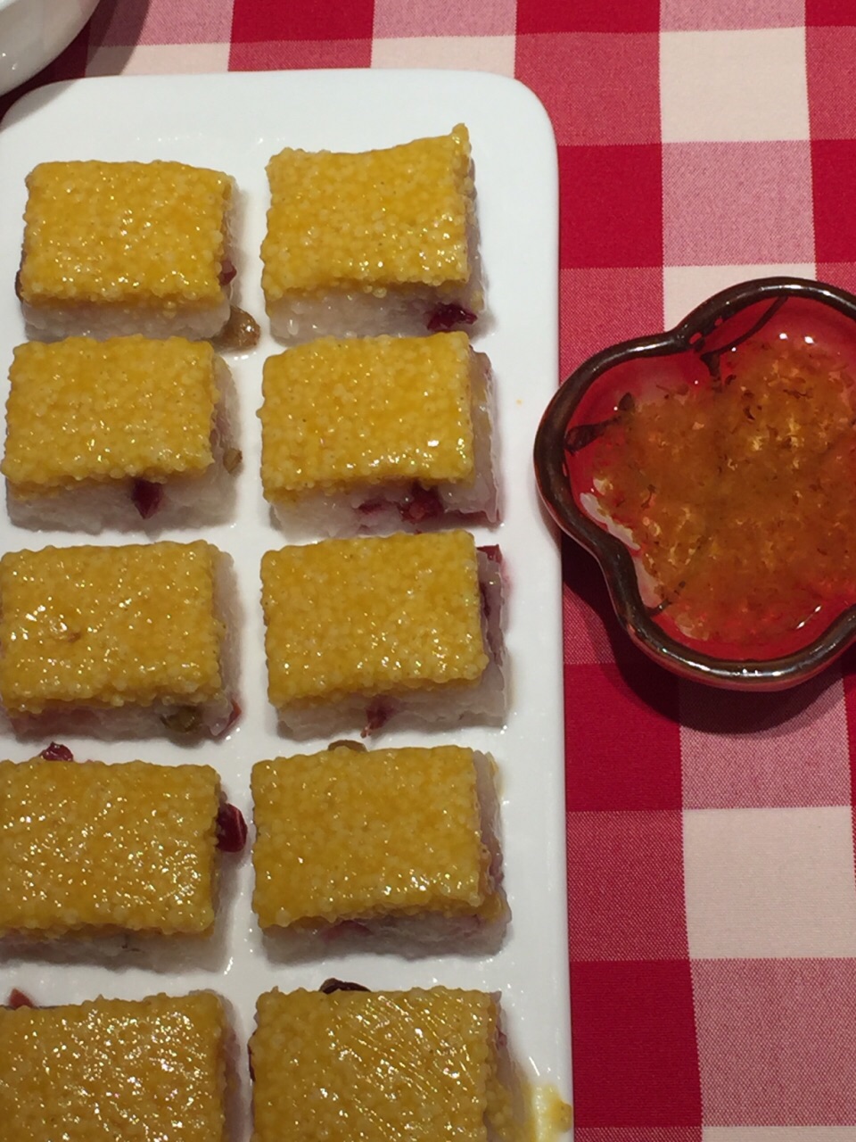吃下来觉得黄米凉糕蘸着桂花蜂蜜非常好吃,甜中带香,黄米糯糯的,黄馍馍也是味道很特别,外皮好像有...