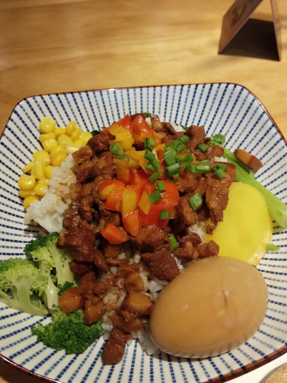 团购了卤肉饭配炖蛋,专门找过去,门面比较低调,里面装修更象咖啡吧而不是餐厅。顾客不多,准备时间不长就上桌了。卤肉不是肉末是小肉条,调味不错,但我不喜欢这种看得见的肥肉,所以挑得蛮辛苦。倒是炖蛋意外地好吃,里面料好多的。