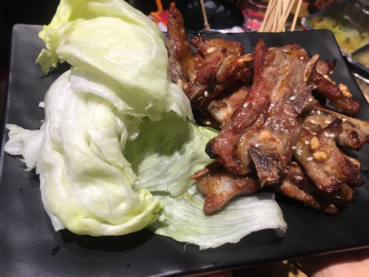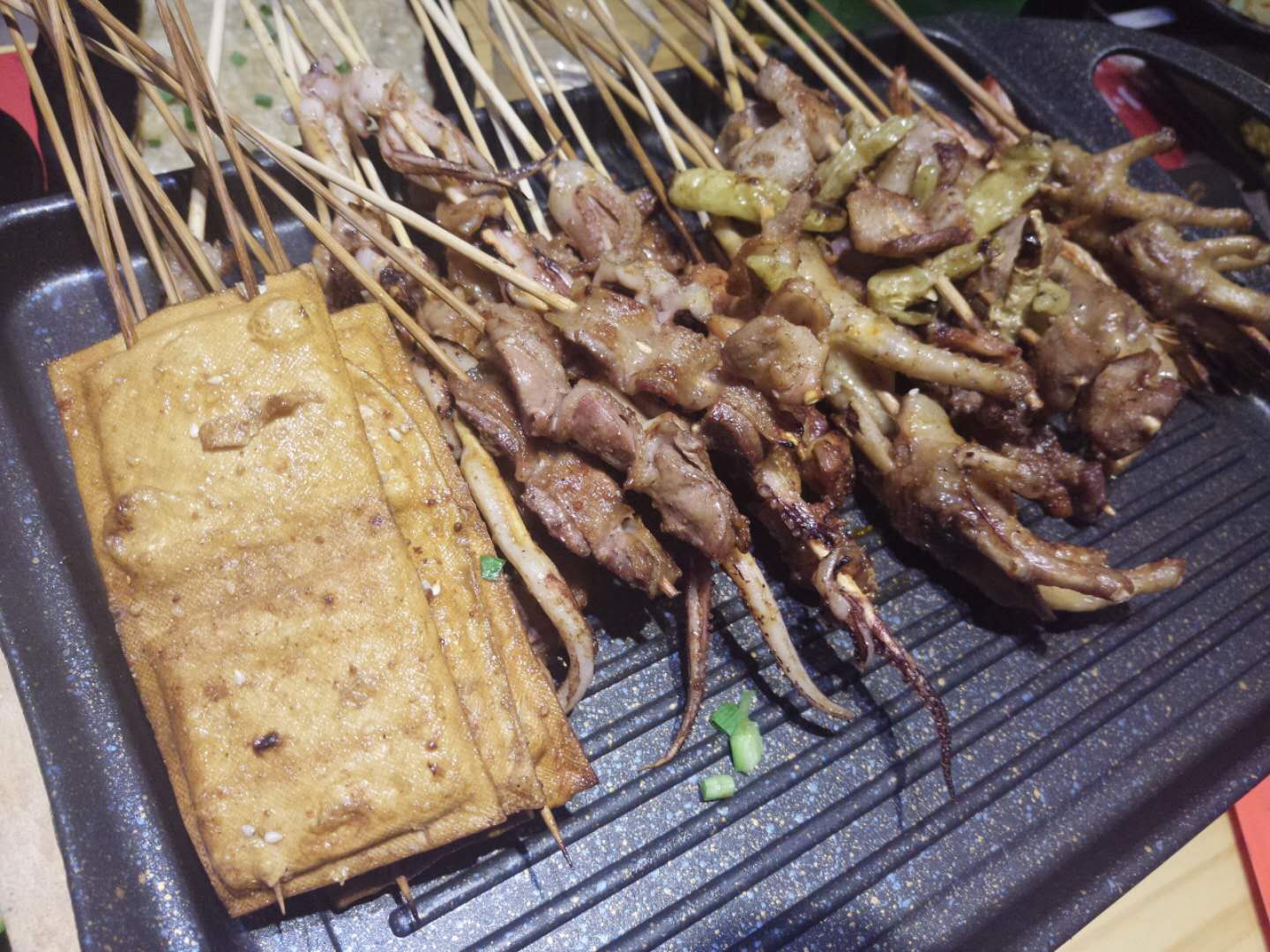 这家店的就餐环境有两种选择,一个是屋内,一个是棚内,我都觉得挺好的,都很干净。 我觉得烤鱿鱼、烤猪蹄、烤虾、烤土豆和烤羊排还不错吃。 烤猪蹄肉挺多的,但是油而不腻。 烤鱿鱼就烤的火候掌握得比较好吧,鱿鱼很Q又比较入味。 烤土豆虽然会咸一点儿,但是口感很赞。 烤玉米其实也还不错吃,很甜,只是已经没有水分了,所以不是很喜欢。 炒泡面则是比较家常的感觉,无功无过吧。 烤羊肉串的膻味儿有点太重了,建议改良下。 锡纸蔬菜味道稍稍淡了点儿,可能习惯了烧烤的重口味吧,有点儿切换不过来。 服务态度很好。