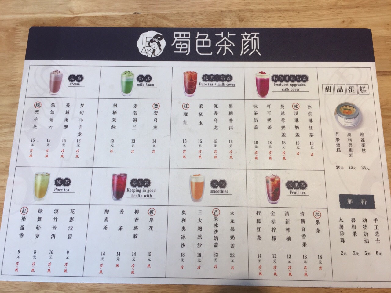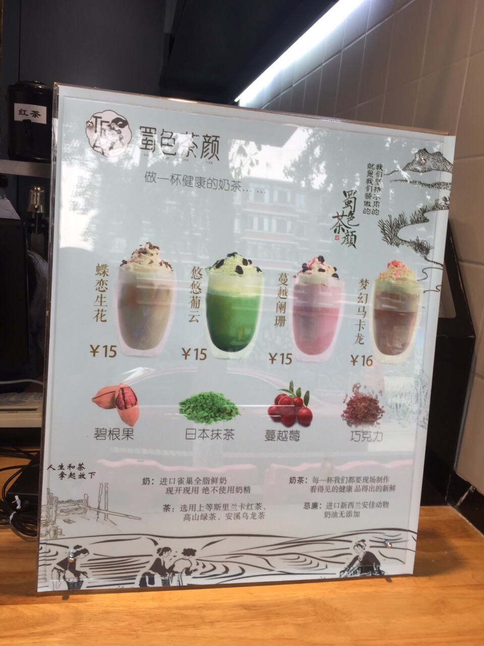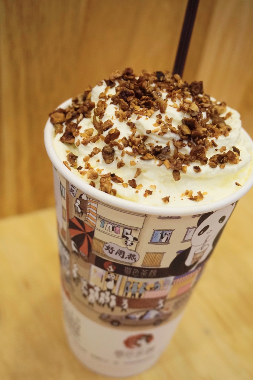 蜀他家的东西不仅材料好,而且口味也比较有特色。奶茶都用的雀巢全脂牛奶,斯里兰卡红茶,高山绿茶,安溪乌龙茶,奶油用得安佳。 我先点了一个我们都很感兴趣的【三大炮】18,满满的花生冰沙,冰沙很细腻,每一口都能吃到花生碎,本来以为三大炮里面会有糍粑但其实没有,上面的一些浓郁的红糖就成为了点睛之笔,太好吃了! 【冰淇淋奶盖】18,也是他家打红圈圈的推荐款,红茶打底,上面加了奶盖和香草冰淇淋,一般不是雀巢就是八喜。冰淇淋和奶盖混合咸甜的味道很喜欢,后来冰淇淋和奶盖再和红茶混合喝起来又是另外一种风味,和外面的那种植物奶油的做的奶盖就是不一样。那些喝到最后奶盖完完整整的剩下了,这里的奶盖就是完完全全的融于红茶之中了。但唯一不喜欢的是珍珠,确实不喜欢这种东西,早知道有我宁愿不要,免得影响我喝水。 【蝶恋生花】15,和【蔓越莓奶盖】18,都各尝了一口,蔓越莓的酸甜也蛮好喝的,蝶恋生花就稍微淡了一些。 他家价格不贵,最贵的水也就22了,确实很良心呢,而且有位置可以坐,还可以坐着休息蹭蹭空调。