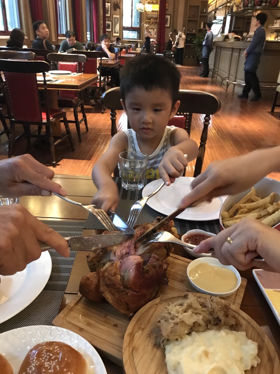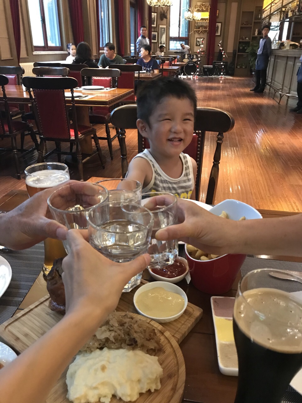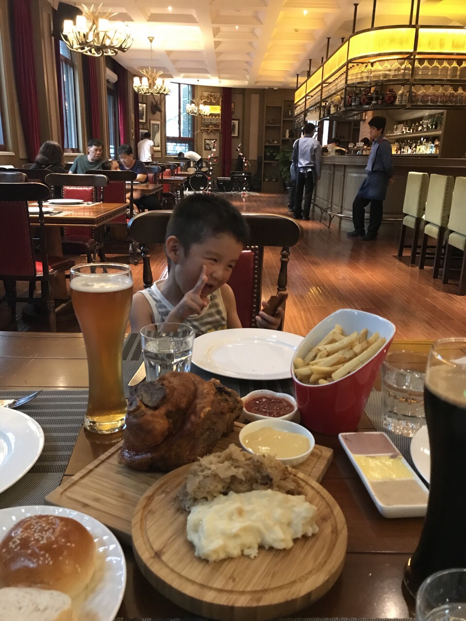 住威廉酒店的时候发现了这家餐厅,就在威廉酒店的一层,可以从外面进到餐厅,也可以从威廉酒店里面穿到餐厅,餐厅环境优雅,晚上7点以后有驻唱,很有情调,虽然听不懂唱什么,但是感觉很惬意!我们三大一小点了德国烤猪肘,物美价廉,量很大,竟然没吃完,最后还打了包。自酿的黑啤和黄啤味道不错!