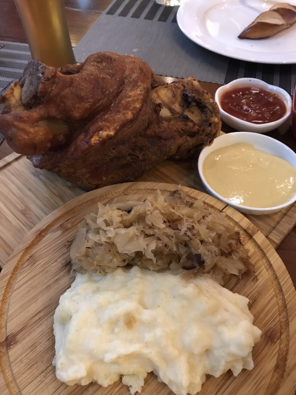 自酿的黑啤和黄啤味道不错!我们三大一小点了德国烤猪肘,物美价廉,量很大,竟然没吃完,最后还打了包