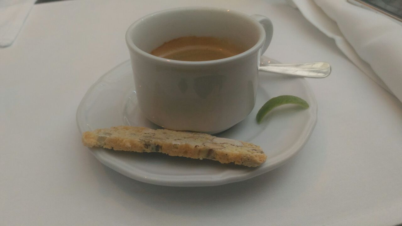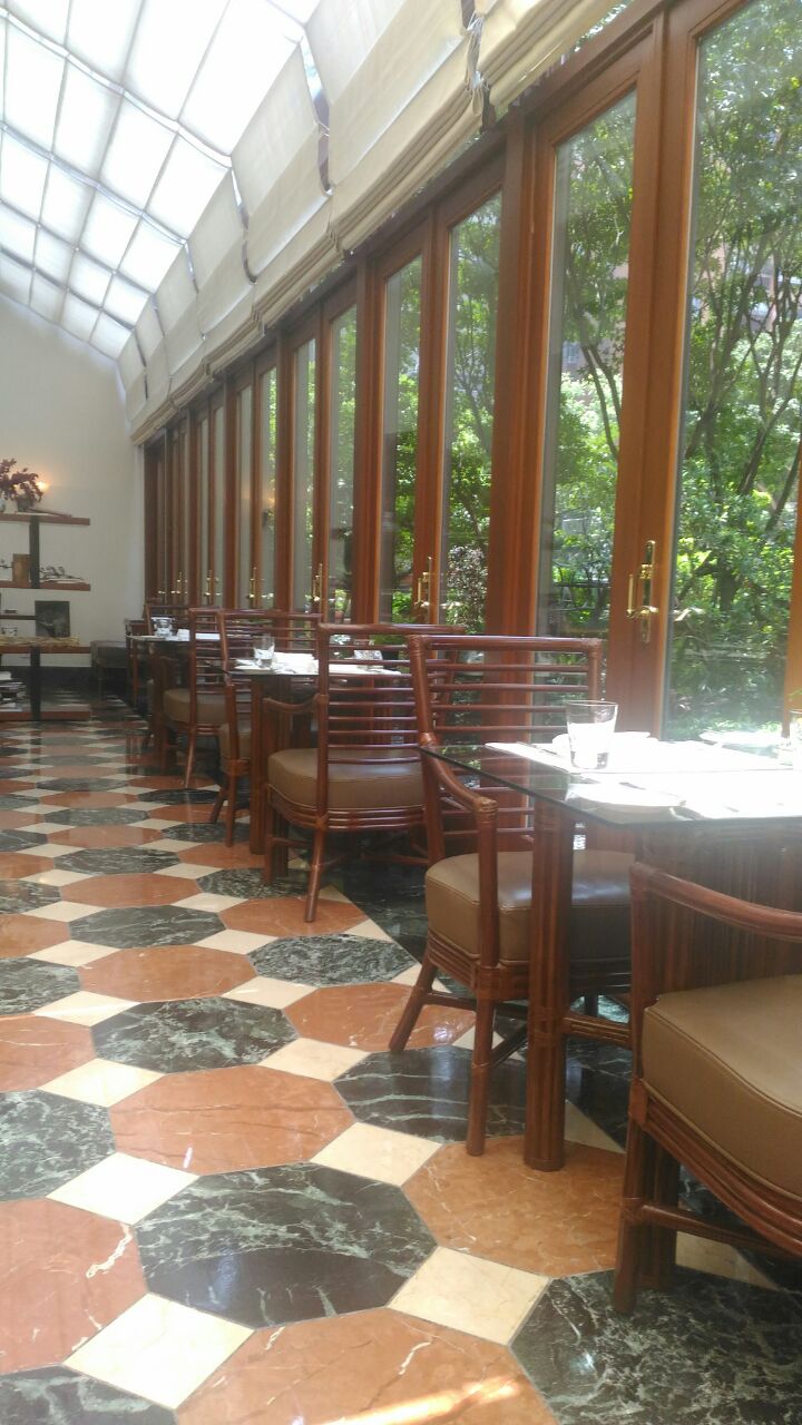 老牌的五星级酒店,采用很多木做装潢,经典格局,桌子之间空间比较大,外国客人不少,回到菜式,龙虾汤不是只有龙虾,还有其他海鲜,不是浓汤,份量少了点但是口味浓郁,rib cap 三分熟,控制不错,但是份量说8安士,好像多了一点,双份浓缩咖啡苦涩,香浓,服务员默契不够,有时间几个人同时收拾但是其他客人就变得没有人理会,训练要加强。毕竟是五星酒店里面的西餐厅。下列价格为RMB