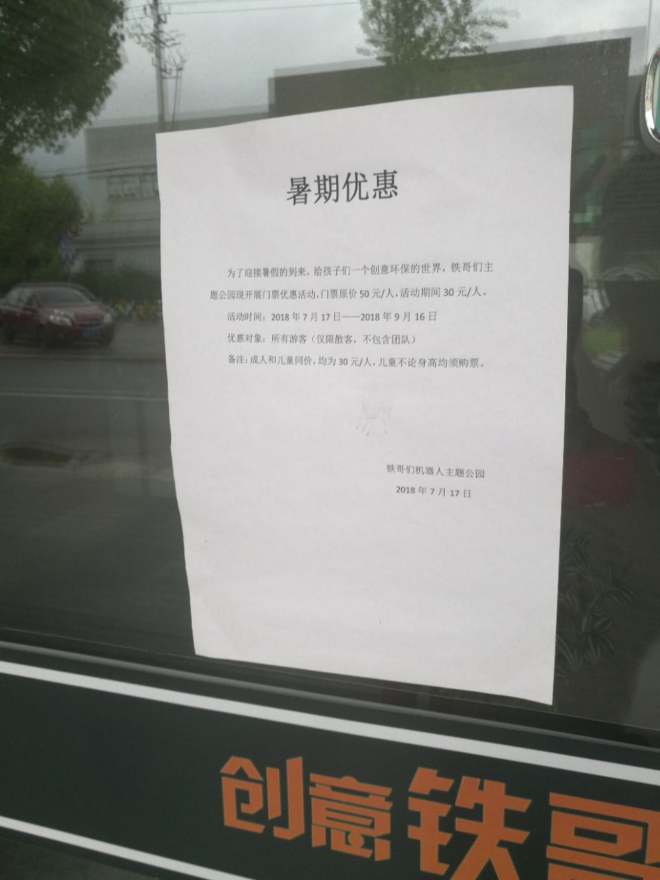 暑假优惠30元,我觉得还是非常物有所值的,对于男孩子来说。里面的机器人都是用废旧的汽车改造的,大部分机器人还有介绍原来是什么车,改造历时多久等等,孩子很喜欢。虽然场馆不大,互动性不多,但觉得还是不虚此行。看前面有评价说一岁多的孩子要买票,我们去的时候,售票处说我女儿一岁多不需要。