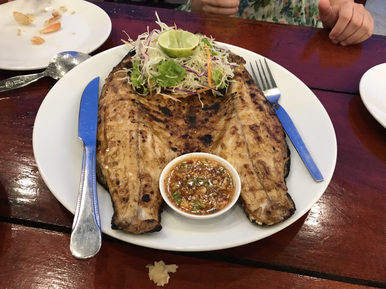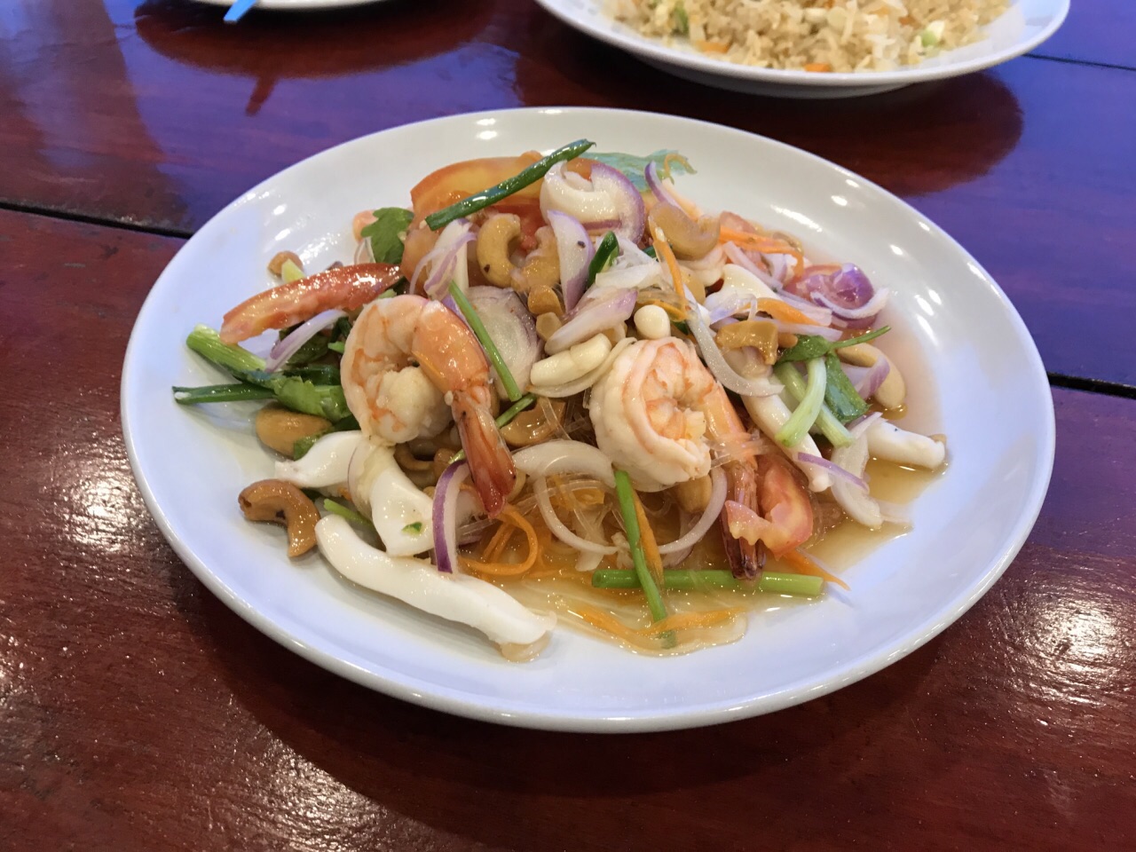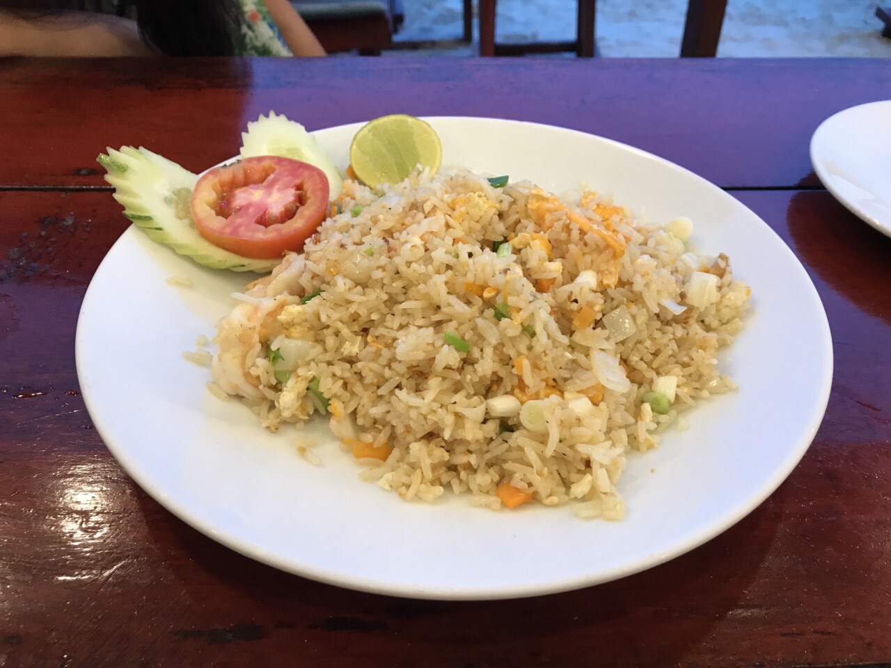 虾炒饭,虾不多,因为饭里全是半生的洋葱和胡萝卜吃起来就辛辣,费劲给孩子挑了半天,鸡蛋少还炒的不均,差评。烤鱼不错,芒果冰很好,炒面一般般。估计不会再去。价格小贵。白米饭一碗要50铢。结帐写的是泰文,稀里糊涂付了总价,其它饭店帐单是英文,至少付的明白。