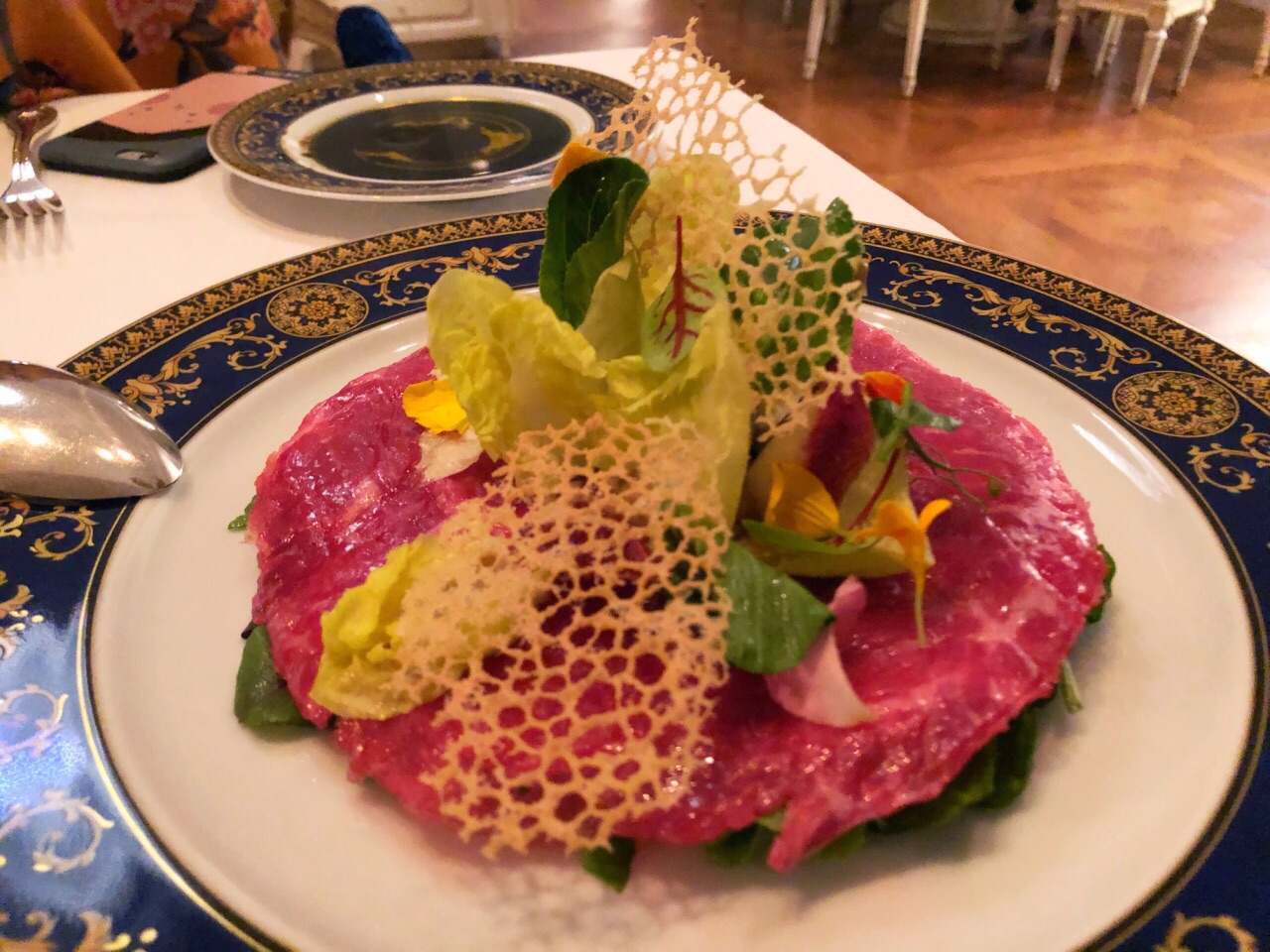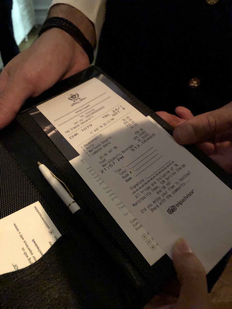 据说是迪拜最棒的意大利餐厅,七夕节当天必须来尝尝~ 提前一天预订了晚上七点半的,最多保留30min,住在酒店很方便哈! 菜单看不懂…只能拍照翻译…服务生小哥意大利人,交流起来比较困难,点菜点了好久…一道道才上来,味道都不错,生牛肉很好吃,鱼很嫩,奶油蘑菇饭很入味,鸡一般般,饮料杯子很重,喝完底下是带范思哲头的难怪了~歌剧院居然不是传统的那种,梅子口味的有点奇特,提拉米苏是真好吃!甜品浪费不少,满足的大餐哟~