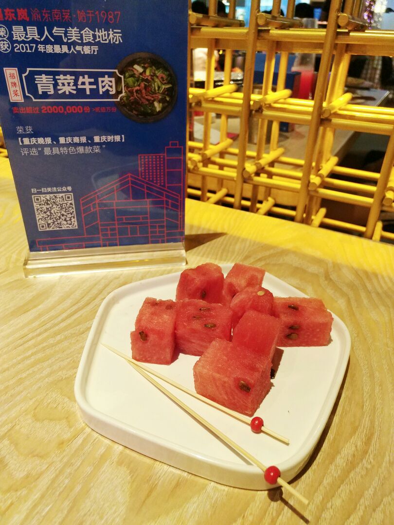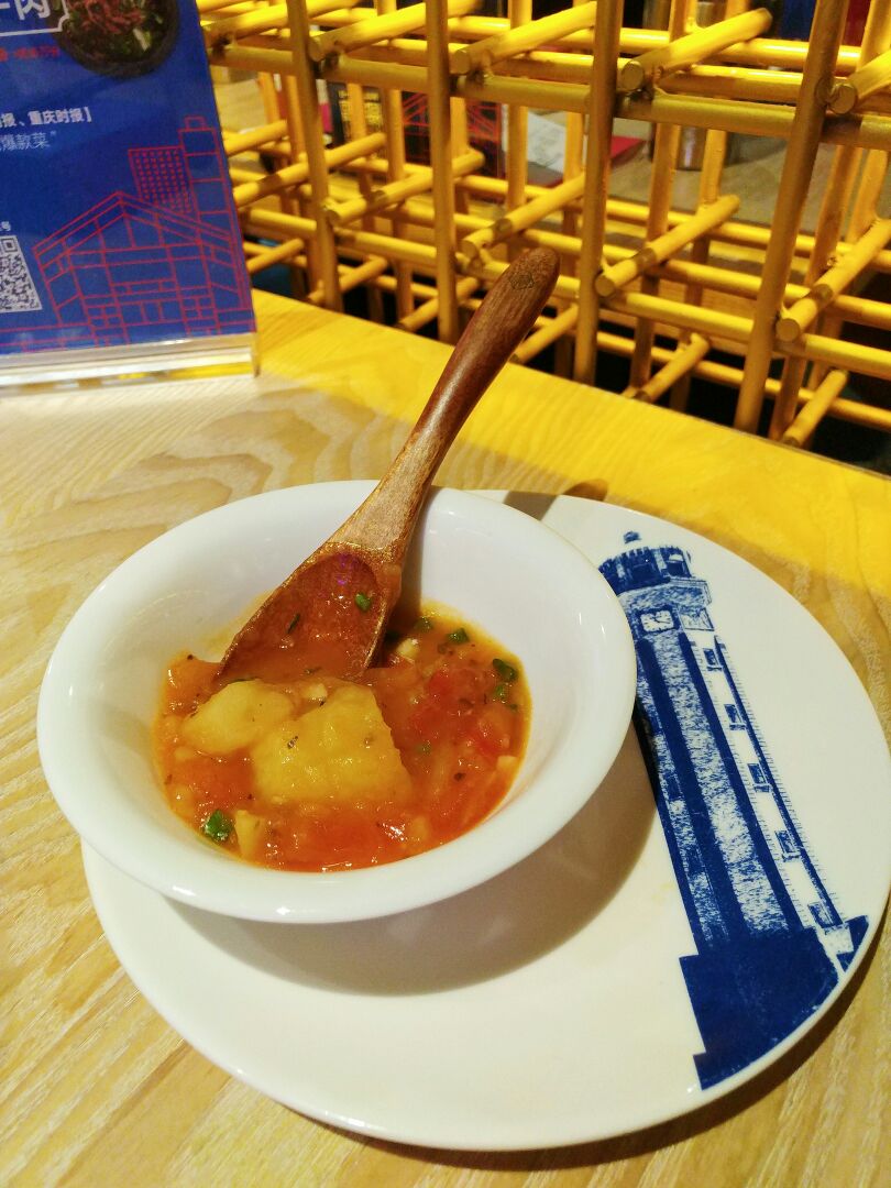 很有重庆黔江特色的一家餐饮店,重口味,份量足,特色菜品多。招牌青菜牛肉石锅器皿,服务员呈上桌时还是热气腾腾的卟卟卟卟冒泡,牛肉条口感细腻、嫩滑,青菜非常入味,咸鲜青香,微辣,品尝这道菜要特别小心烫口。蕃茄土豆泥实际上是蕃茄土豆小片,不是完全的成泥状,口感很鲜,对味蕾有诱惑力。童年三角粑就是三角形的烤米糕,呈糕的竹器很漂亮,令人立马与原汁儿原味儿联系起来。店面比较大,上菜快,装饰非常的重庆特色,服务态度很好。