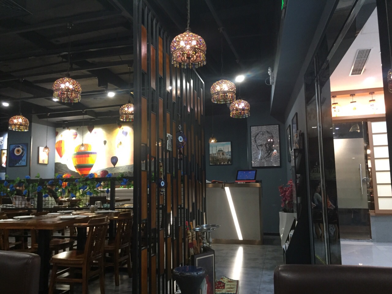 淮海中路无印良品的楼上 餐厅装潢很有特色 土耳其氛围 鸡肉卷土豆条 饼比较多 点了鸡肉卷 量挺大的 还送了一颗小面包 特色布丁特别好吃 凉凉的布丁里面有米粒 服务不错 唯一失望的是最后开发票的时候打错了抬头 不够仔细