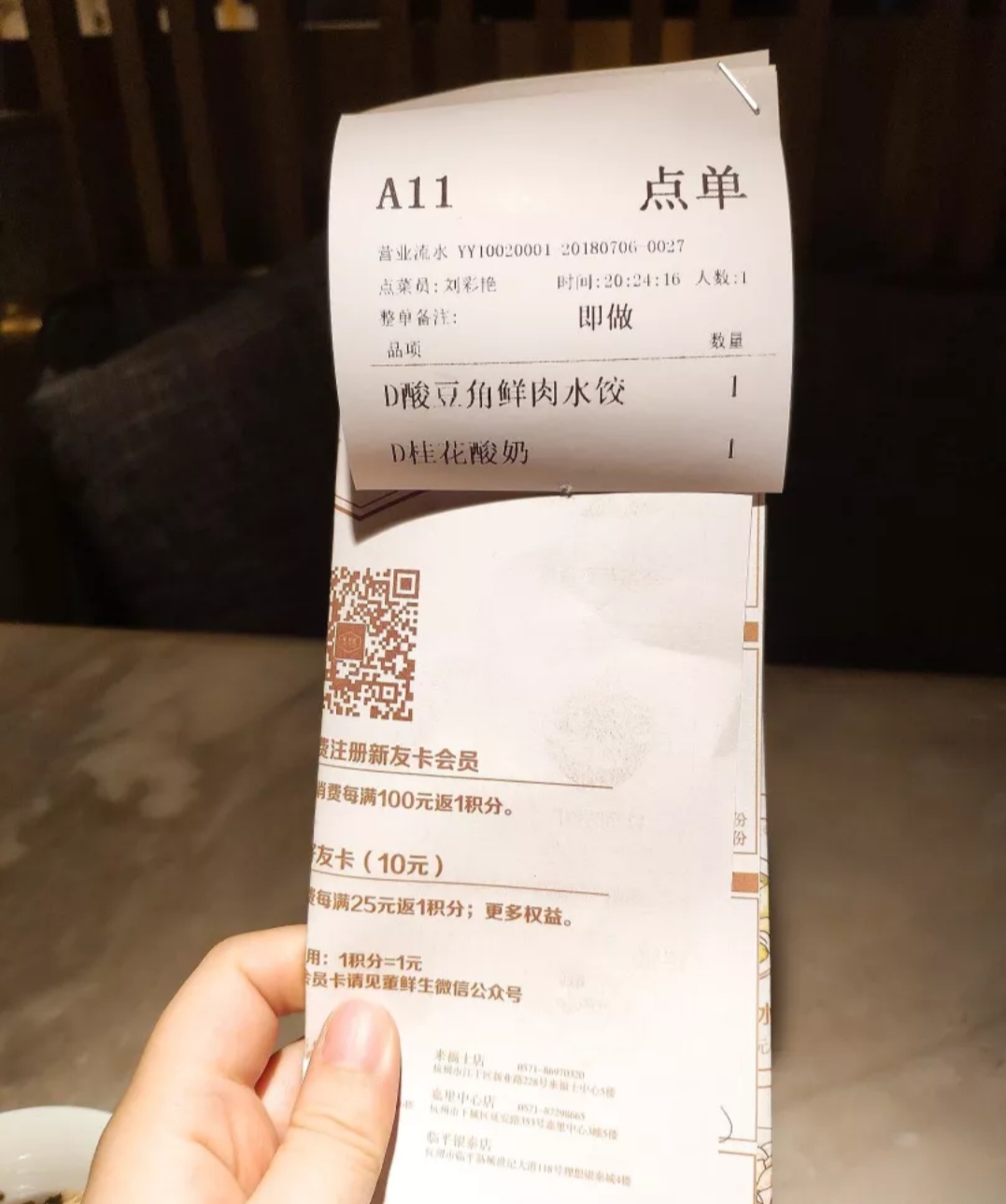已经不是第一次去董鲜生吃饺子,环境是真的好,高档饺子店,所以价格也是高档价格,12个一份饺子最低38.酸豆角饺子个人觉得蛮不错的,很特别,别的地方没吃到过这个品种。桂花酸奶不酸也不是很甜,唯一不好的就是比饺子先上来,吃了酸奶我更饿了。。。。