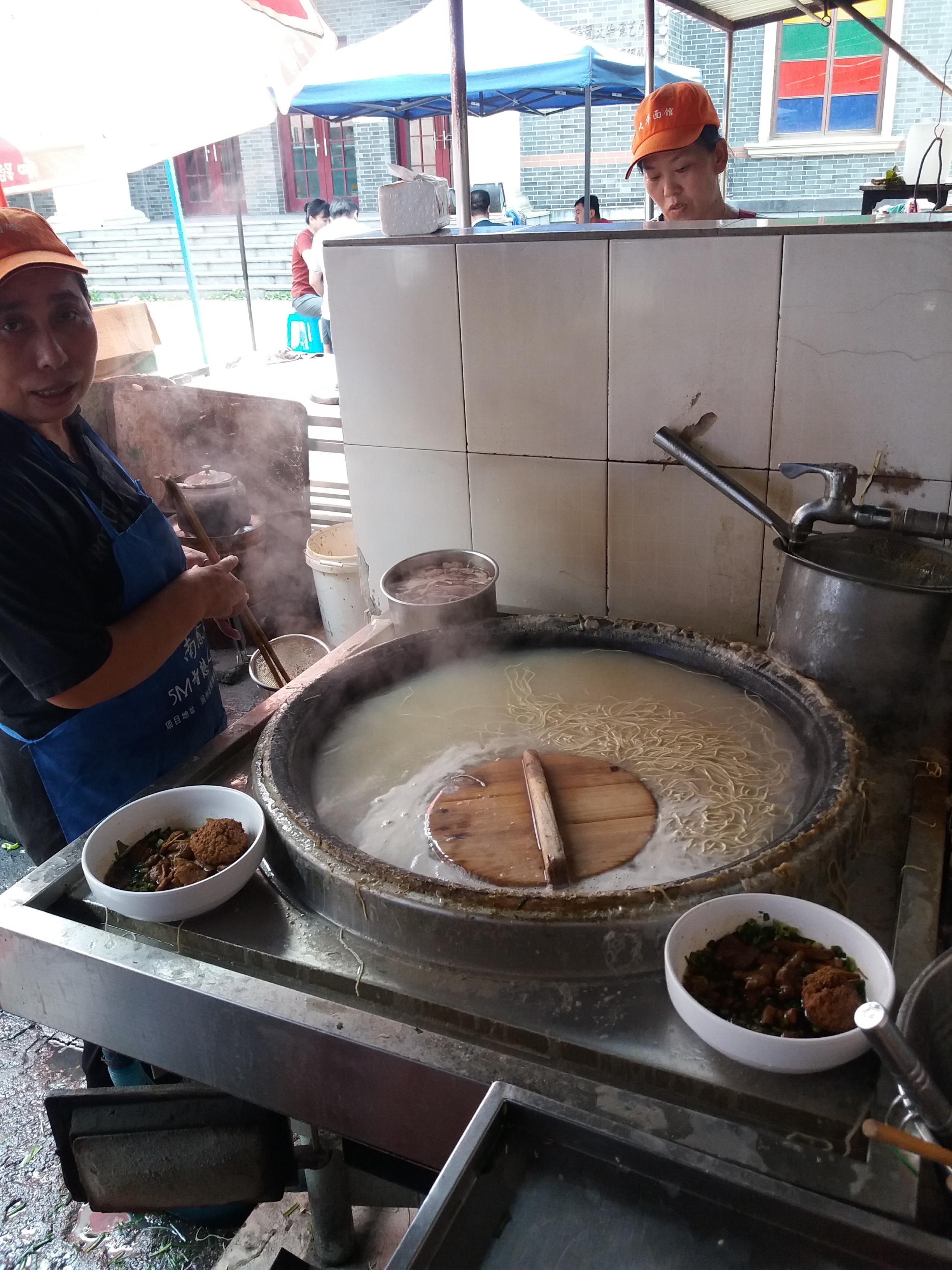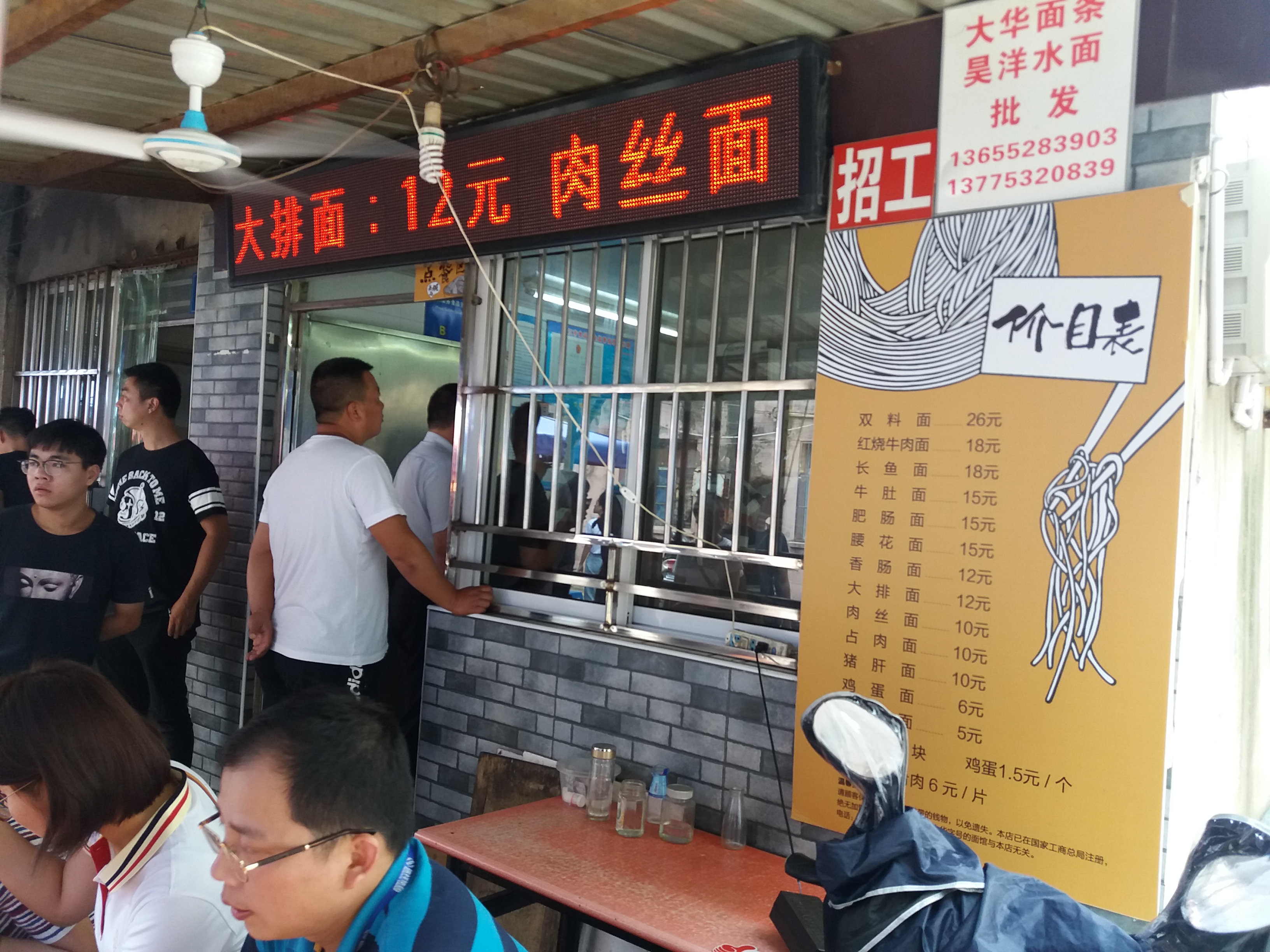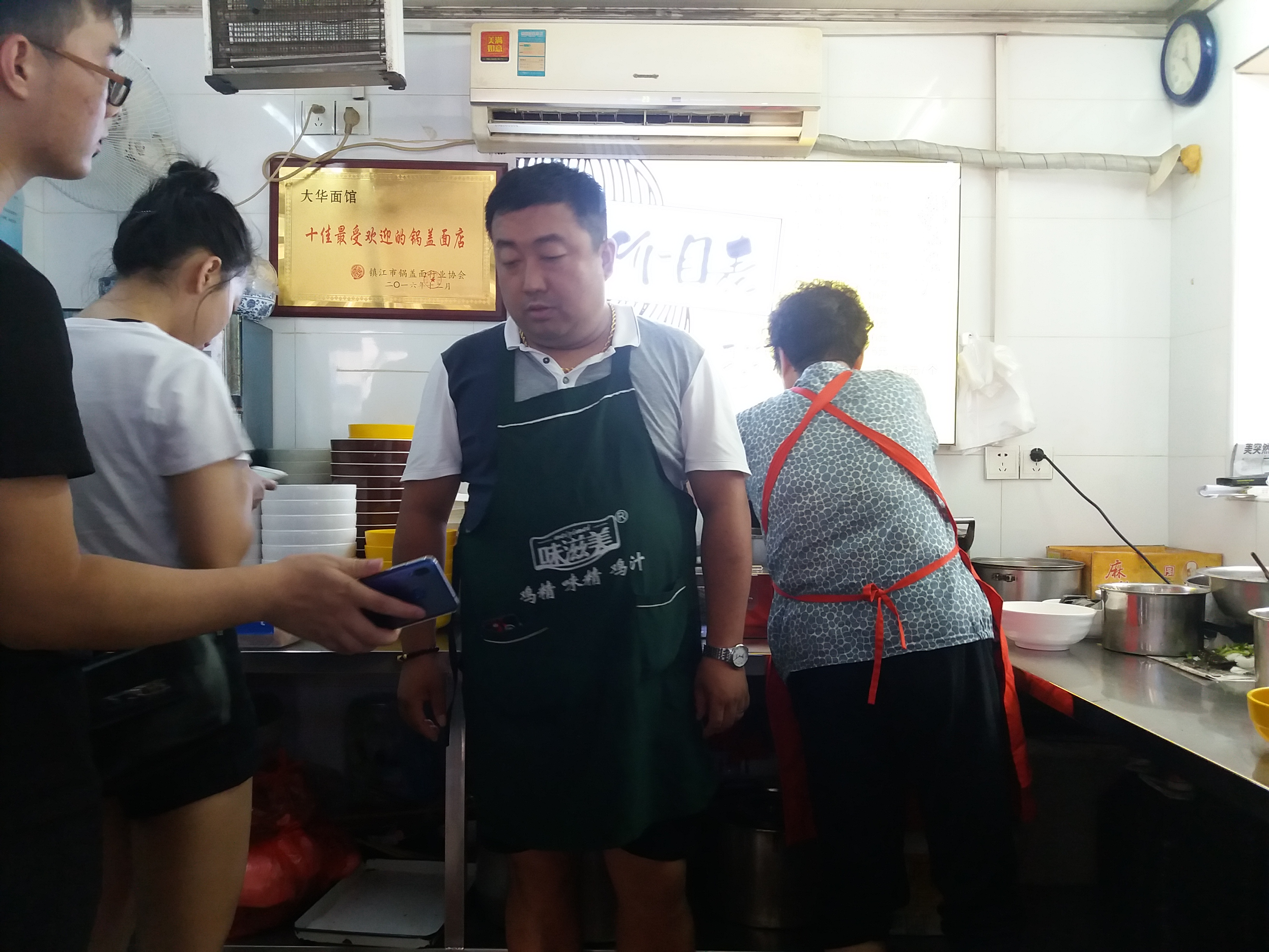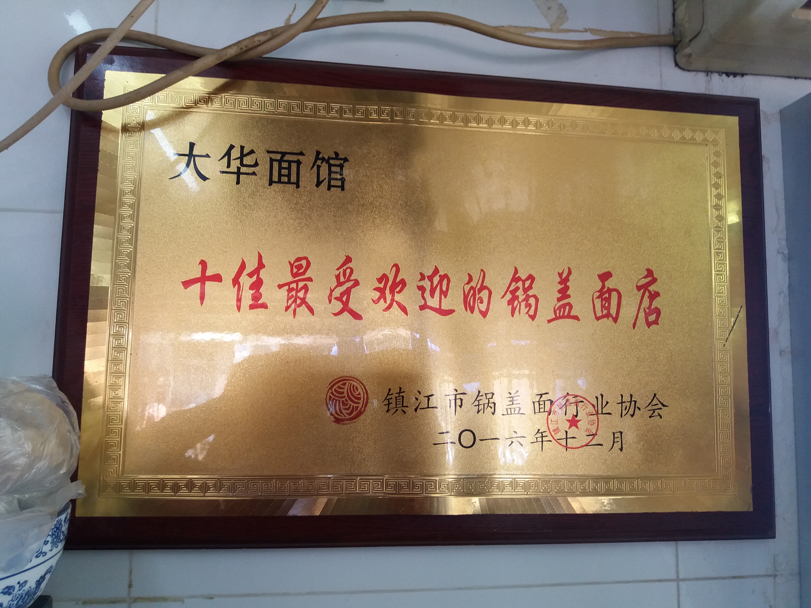 1、只知道镇江有碗著名的锅盖面,也属于全国的十碗面之一。但是,不知道哪一家的锅盖面相对正宗、保持原味,并得到当地人的青睐。一到镇江,坐上出租车就开始向司机打听此事,问了之后,对照网上的评论,我便把目标锁定到了大华面馆的那碗锅盖面。 2、位于镇江市润州区大西路363号大华面馆与大华影剧院成直角比邻,店面有些类似于路边摊,或者说大排档风格,有着浓烈的市井气息,店家两个室内店堂内的11个简易餐桌椅最多同时能坐上约三十人左右,而店外支撑起的几个简易棚内放置的方餐桌却可以同时容纳约四十个人左右,这样一来,室内外同时可坐下七八十人就餐。即使这样,周末,节假日,还是人满为患,坐着吃,站着吃,站着吃的等着坐着吃的吃完后再坐下来吃。 3、锅盖面说是与锅盖有关,因为煮面的同时有一个小的木质锅盖始终放在锅内与面条同时在煮,但是,镇江当地人,且不止一个人告诉我,镇江的锅盖面其实与锅盖没有什么关系,那个锅盖放不放入锅内,丝毫不影响面的质量和口感。 4、镇江的锅盖面有两个特点:面条的嚼劲与红汤汤料中的酱油的熬制。大华面馆内的人点员告诉我,镇江的锅盖面就是酱油面,说得好听的叫红汤面,核心技术就是看你如何熬制这个酱油了。 5、镇江红汤面的汤料,也不是我们平时强调的高汤汤底,其实就是加入下面条那个“浑浊”不堪的面汤水,这一切都是在食客眼皮底下操作的。所以,相对于内地其它地方强调面的汤底,无论白汤面,还是红汤面,都会神秘兮兮地介绍加入多少食材、熬制多少小时的高汤等等,镇江汤面的汤料就是在不择不扣地贯彻的祖宗的教诲——原汤化原食。 6、镇江锅盖面也不是绝对没有白汤面,只是比较少用白汤,但是鸡汤、鱼汤下面时就只能吃白汤面了。 7、镇江的锅盖面的浇头,也没有绝对的一致和统一,完全根据店家什么拿手烧什么,食客则是喜欢吃什么浇头就加什么浇头了,如:长鱼、牛肉、腰花、肥肠、牛肚、肉丝、排骨、香肠、鸡蛋、香干、臭干、肴肉、肉圆,等等。 8、还有一个属于镇江通行的做法,镇江上面馆吃面都可以免费添加面条的,而不是只有少数锅盖面的店家。 9、我到大华面馆时,大部分浇头都已买完了,时间也就是中午十二点十五分左右,只有猪肝、腰花、肥肠、肉圆四个选项了。我点了肥肠面(15元),再加一块肴肉(6元),面汤中漂浮着的绿色有三种食材:香菜、芹菜、韭花(韭苔),店员告诉,冬天没有韭花就用青蒜。 10、说句实话,大华面条的口感没有什么特别之处。