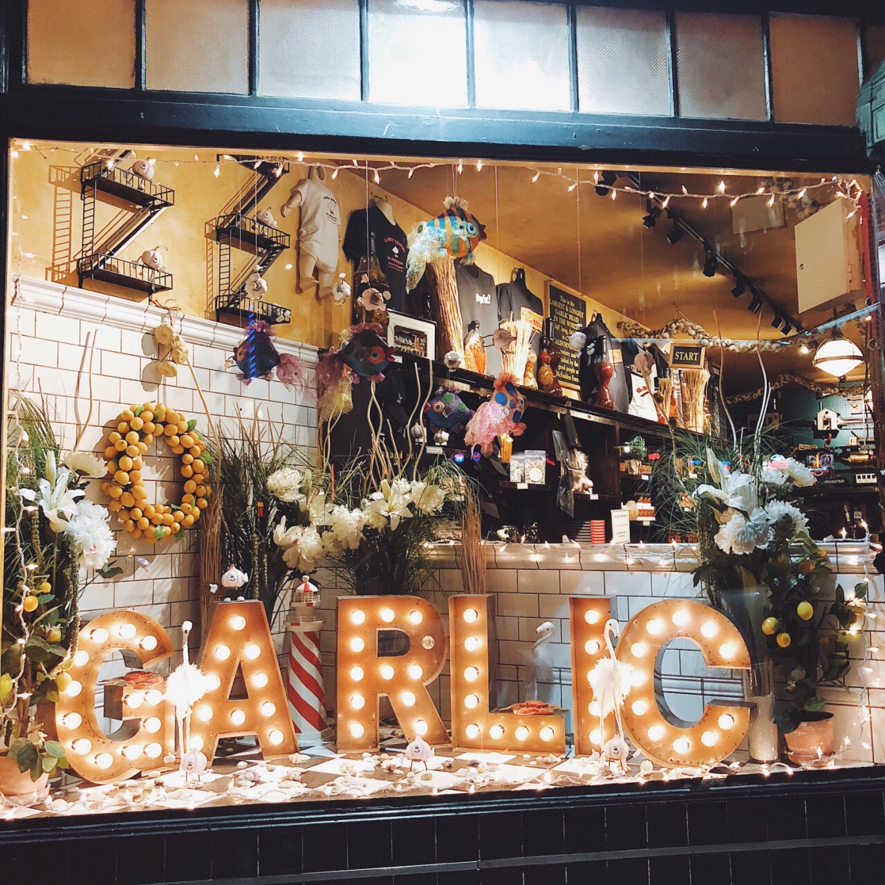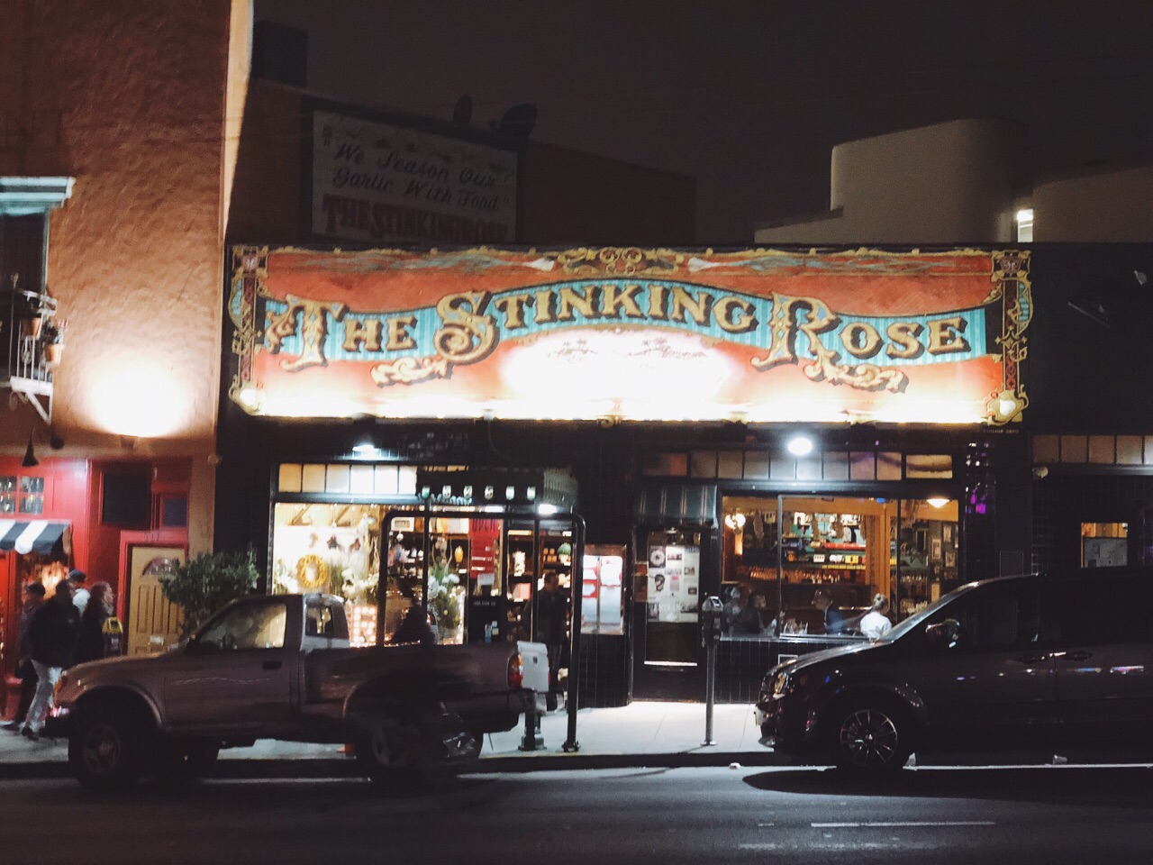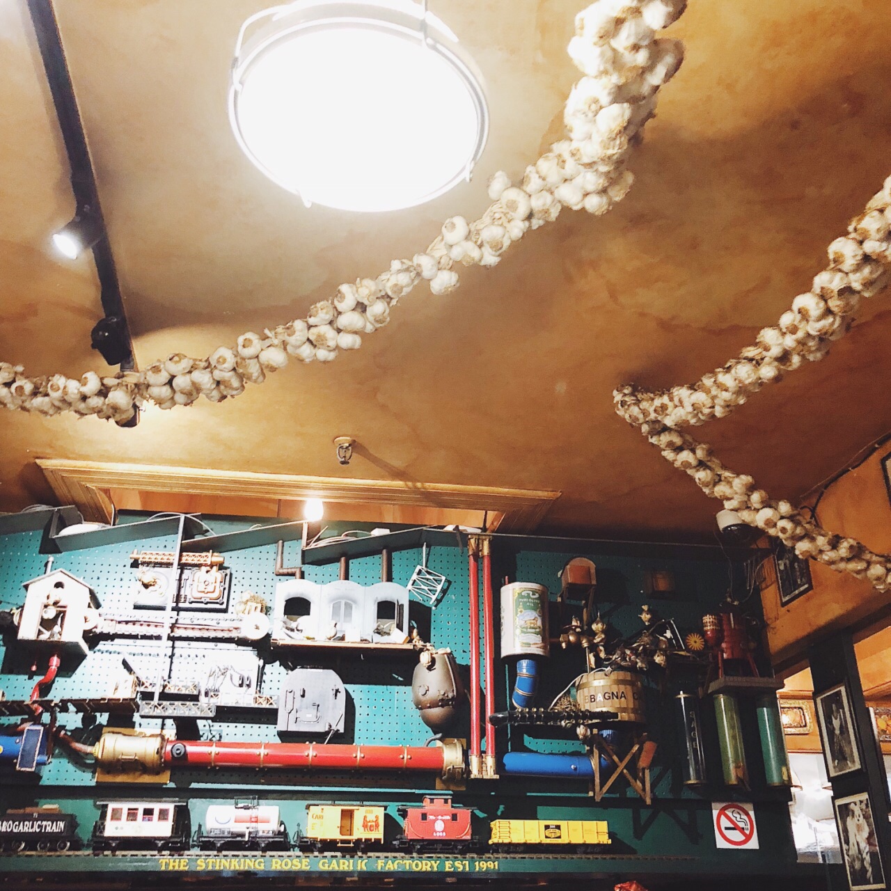 旧金山的朋友带着来的 晚上8点 还有人在排队 不过没多久就坐下了 平时的话最好预约 否则排队挺久 很出名的一家意大利餐厅 以蒜为主题 门外的橱窗里有蒜的吉祥物 店里墙上更是挂着一串串真的蒜哦 也卖各种蒜调制品 菜自然是以蒜为特色。 朋友是广东人 超爱吃海鲜 所以点的两道菜是铁板海鲜和海鲜炖[笑哭] 不过味道都非常赞 和青口贝很嫩 虾的皮已经剥掉了 一口一个爽歪歪 酱汁挺特别 很入味 份量挺足 两个妹纸两份菜就够 甜品在另外的菜单上 吃完主菜可以问服务员要 推荐吃他家独有的蒜味巧克力冰激淋啊 挺特别 两人吃光盘呀 不过晚上睡觉的时候口里还是有股蒜味的[笑哭] 妹纸悠悠的对我说 口里满是蒜味 这个时候好想找个人接吻呀 我下意识的裹紧自己的被子 问 你想找谁[懵逼] 哈哈哈哈哈 放心 不会找你啦[吐舌] 哈哈哈哈 那么以后找了男朋友 一定要带他来这里呀[机智]