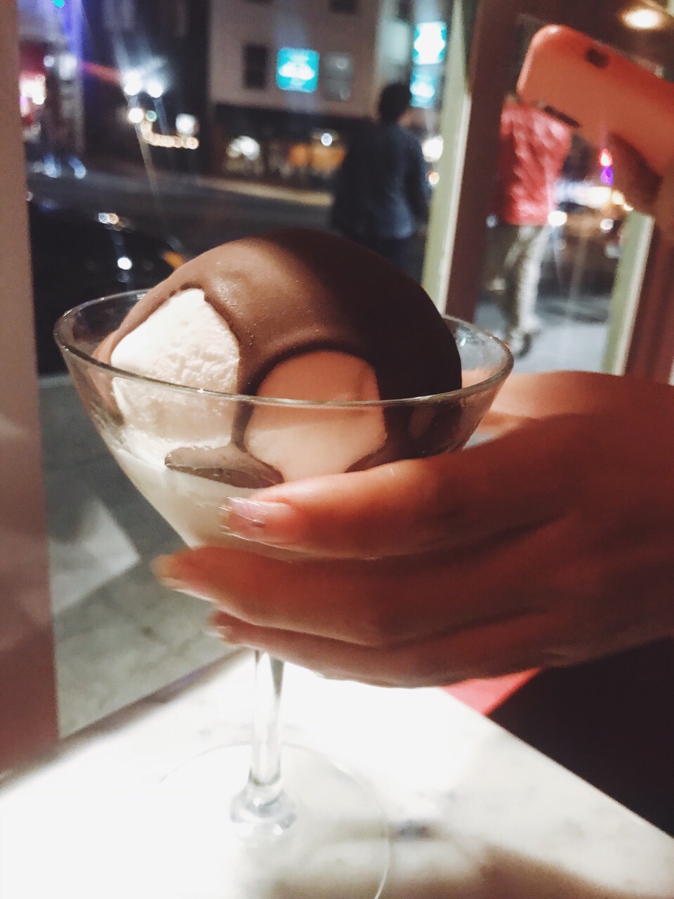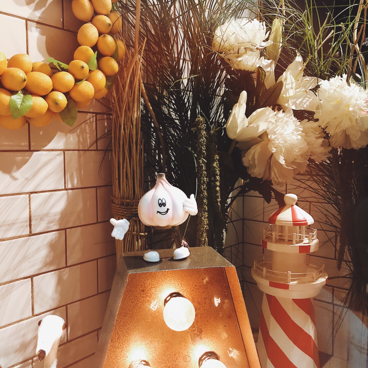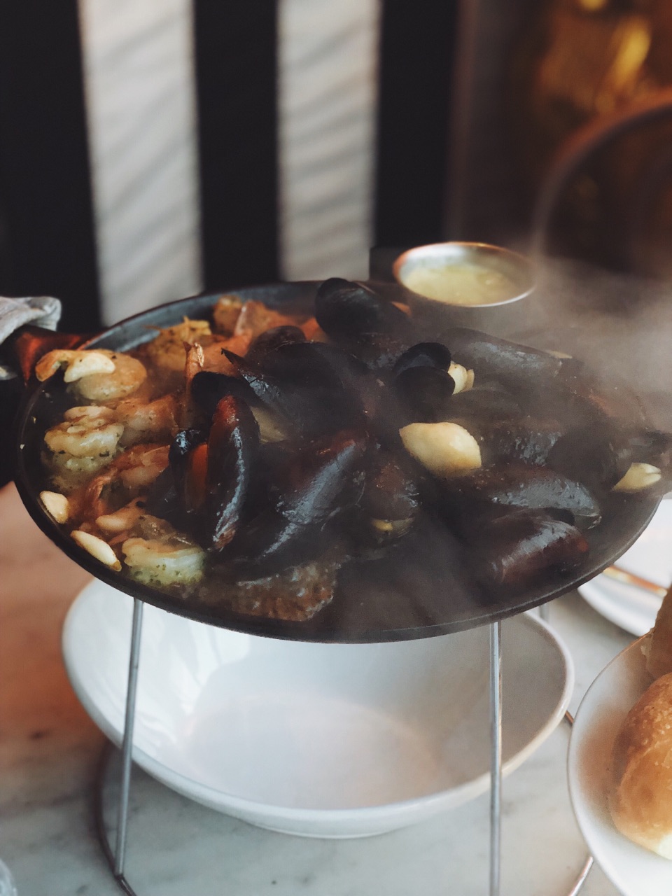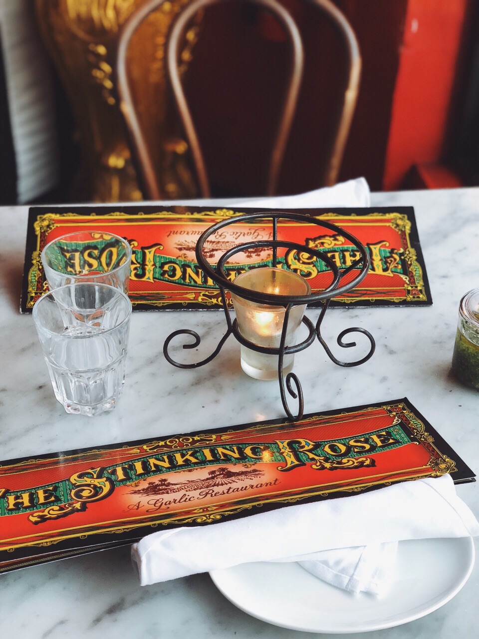 旧金山的朋友带着来的 晚上8点 还有人在排队 不过没多久就坐下了 平时的话最好预约 否则排队挺久 很出名的一家意大利餐厅 以蒜为主题 门外的橱窗里有蒜的吉祥物 店里墙上更是挂着一串串真的蒜哦 也卖各种蒜调制品 菜自然是以蒜为特色。 朋友是广东人 超爱吃海鲜 所以点的两道菜是铁板海鲜和海鲜炖[笑哭] 不过味道都非常赞 和青口贝很嫩 虾的皮已经剥掉了 一口一个爽歪歪 酱汁挺特别 很入味 份量挺足 两个妹纸两份菜就够 甜品在另外的菜单上 吃完主菜可以问服务员要 推荐吃他家独有的蒜味巧克力冰激淋啊 挺特别 两人吃光盘呀 不过晚上睡觉的时候口里还是有股蒜味的[笑哭] 妹纸悠悠的对我说 口里满是蒜味 这个时候好想找个人接吻呀 我下意识的裹紧自己的被子 问 你想找谁[懵逼] 哈哈哈哈哈 放心 不会找你啦[吐舌] 哈哈哈哈 那么以后找了男朋友 一定要带他来这里呀[机智]