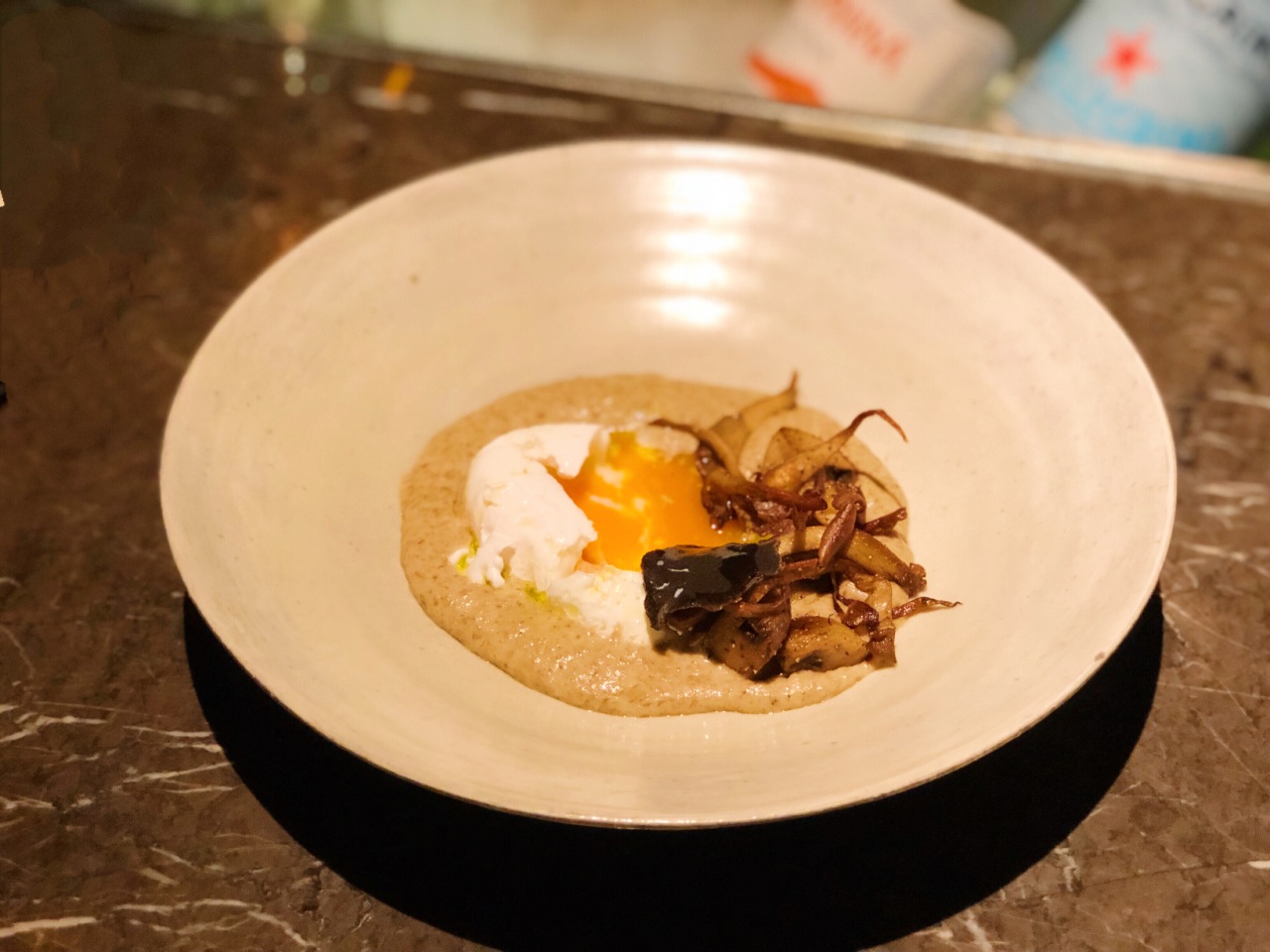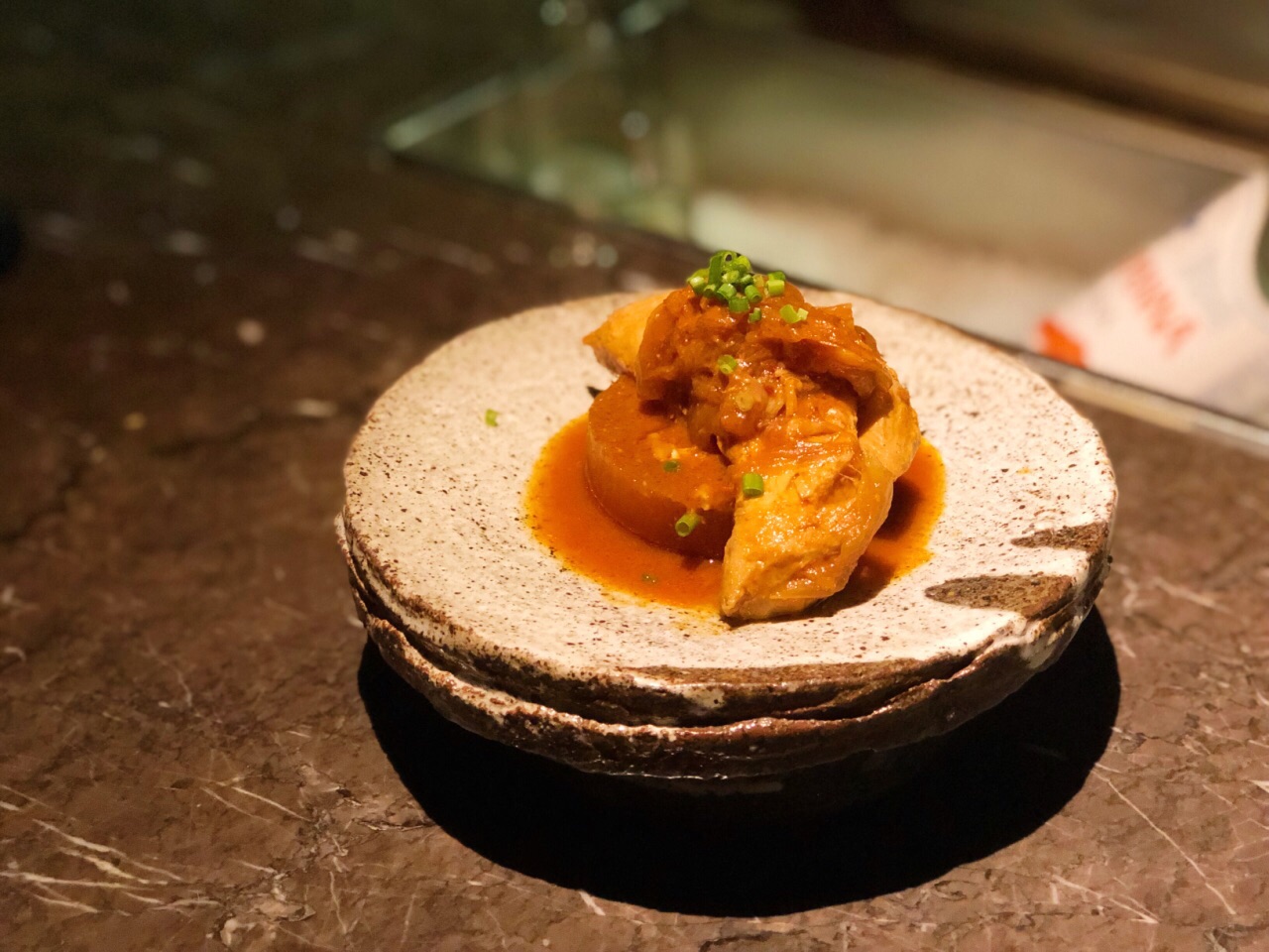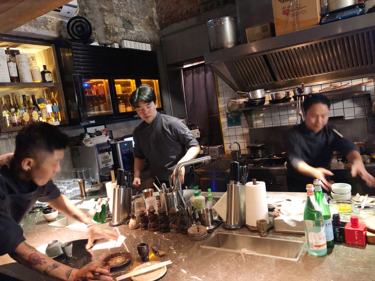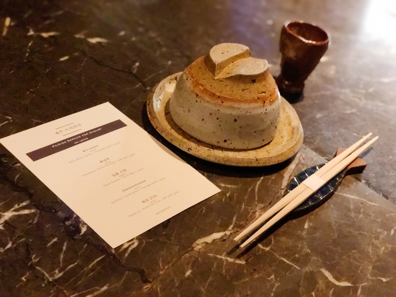 超级难预约的一家店。只能每月一号零点抢次月的位置。时间不定,按预约顺序进行分配。预约+等待,居然加加减减快4个月才吃到这餐。菜单每月更换,也就是,预约时,你并不知道迎接你的Menu是什么。 愚园路上的低调门面,如果不是按照门牌找来,一定会错过。 8月菜单为10道菜。 拉达都乐配伊比利亚火腿 平菇配温泉蛋黑松露 韩国泡菜粉丝饺 葱香鸡翅 辣炖萝卜鲅鱼 长白山黑猪肉配罗勒芥末酱虾酱 炖牛肉配烤面包 比目鱼生鱼饭 韩式辣汤 抹茶提拉米苏 10道菜里除了比目鱼生鱼饭,其他都是两人Share,看起来小小一份,没想到最后也吃得很饱。 Chef格外热情,会介绍食材产地,聊韩国风土人情,笑容灿烂。 另一位Chef的侧脸很像鬼怪里的孔侑。 菜品的话,平常心来说,还是值得再来一次。 当然如果算上预约和等待的感情分,期望值过高,就另当别论。 餐前酒很爱,一小盅有点不过瘾,餐前小食也喜欢。 伊比利亚火腿配马苏里拉芝士和节瓜、茄子。 平菇配温泉蛋黑松露、长白山黑猪肉配罗勒芥末虾酱、比目鱼生鱼饭、抹茶提拉米苏都还不错。 韩国粉丝泡菜饺,饺子皮有点软掉了,泡菜的滋味略显平淡。 葱香鸡翅,鸡翅内部酿入肉糜和葱,鸡翅皮略有点腻,鸡翅到时嫩得很。 辣炖萝卜鲅鱼,萝卜入味,鲅鱼没什么腥气,但是平淡的没有任何新鲜感。 奶油蘑菇浓汤的浓郁版本配平菇和温泉蛋,画龙点睛之处在于那一片黑松露。 长白山黑猪肉,肉质各位鲜嫩,肥而不腻,小生菜也格外鲜嫩脆爽,搭配的三款蘸酱都很有特色,虾酱和罗勒芥末酱最爱,解油腻又提鲜。 比目鱼生鱼饭,比目鱼是活杀制作,Chef就在你面前杀鱼。韩式辣酱的味道有点盖过比目鱼的鲜味,石锅拌饭的高配版本。建议先吃两口比目鱼,再把饭拌匀。 韩式辣汤,或者说韩式大酱汤?里面应该有小鱼干或是虾米提鲜,清新爽口。 抹茶提拉米苏将咖啡的苦、抹茶的浓郁和甜度融合得恰到好处。