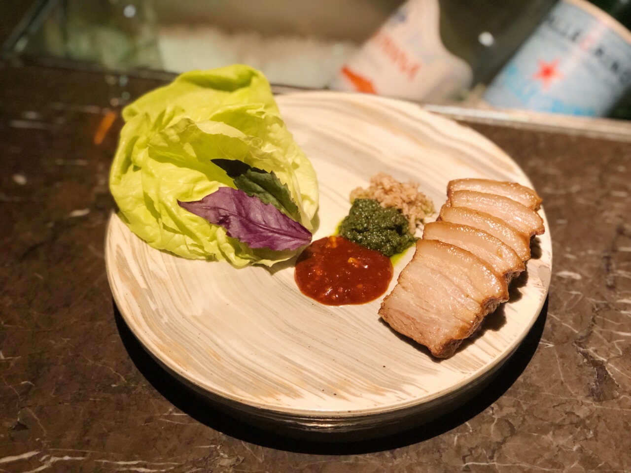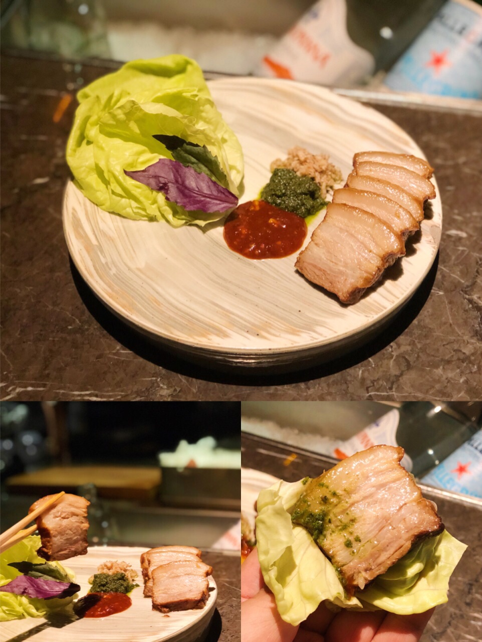 ...,肥而不腻,小生菜也格外鲜嫩脆爽,搭配的三款蘸酱都很有特色,虾酱和罗勒芥末酱最爱,解油腻又提鲜