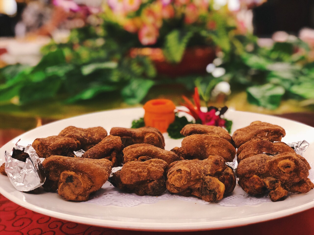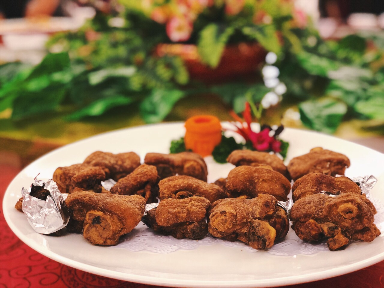 办理入住完毕速速移步至王子大酒店4楼的中餐厅,足不出酒店即可品味地道土楼客家菜,舟车劳顿的一天以饕餮盛宴收尾甚感欣慰。 我认为图1⃣️这道菜就应该叫『男人』[微笑] 男人都是大猪蹄子虽然个头小了一点 吃完这一盘外脆里糯的金牌脆皮猪手,希望能像奥运举重冠军张湘祥一样强壮有力[加油] 五花八门的融合菜荟萃一桌,有种扑面而来的热闹喜庆且听我如数家珍娓娓道来~ 锦绣烧味大拼盘首当其冲扑面而来的粤式风情,白灼牛肉百叶和酸菜煮酸笋比较清爽,不慎将大筷酸笋送入口中,竟然隐约有种臭豆腐的迷之气息,不知你们是否也能感同身受[懵逼] 糖醋菊花鱼跟松子桂鱼颇有异曲同工之妙,酱汁酸甜开胃,鱼肉鲜嫩美味。 煮珍珠粉不由自主联想起乐忻经典有滋有味的老鼠粉,这满满当当一大盆酸菜肉片煮粉,与之相比口味着实寡淡了些。 点心方面对其貌不扬的特色炒发糕青睐有加,香甜松软的炸糕可以恰到好处垫饥。 作为不折不扣的芋头控,实名喜欢客家芋子包,稠厚软糯的芋包正中下怀,包裹馅料鲜香四溢回味无穷。 吃饱喝足不妨去一旁的和兴楼,观赏诗情画意的土楼夜景,与白天相比多了一份迷离夜色笼罩中大红灯笼高高挂起兴致所至还能唱唱歌哼哼小曲儿