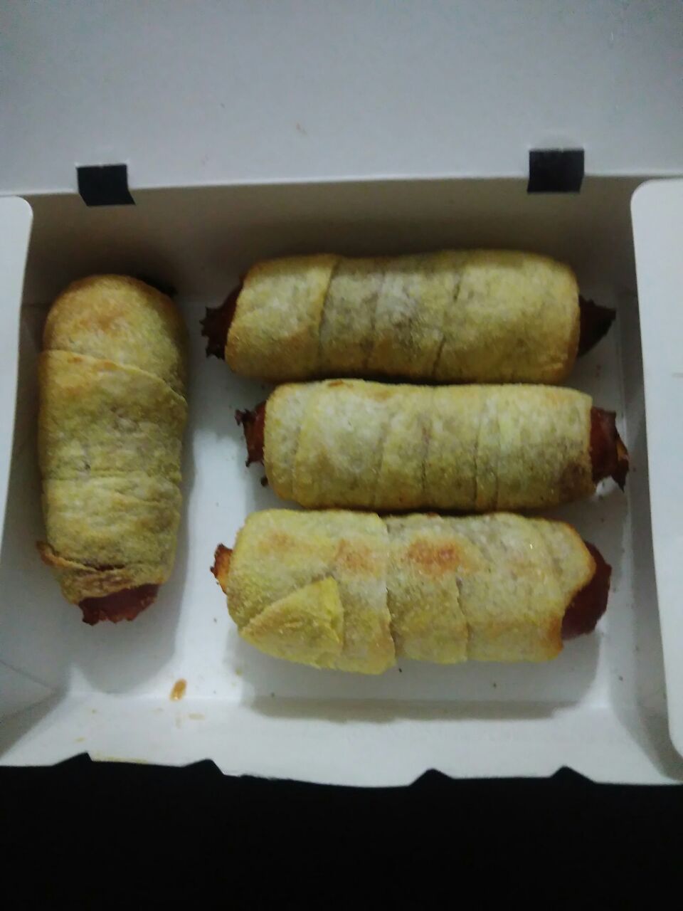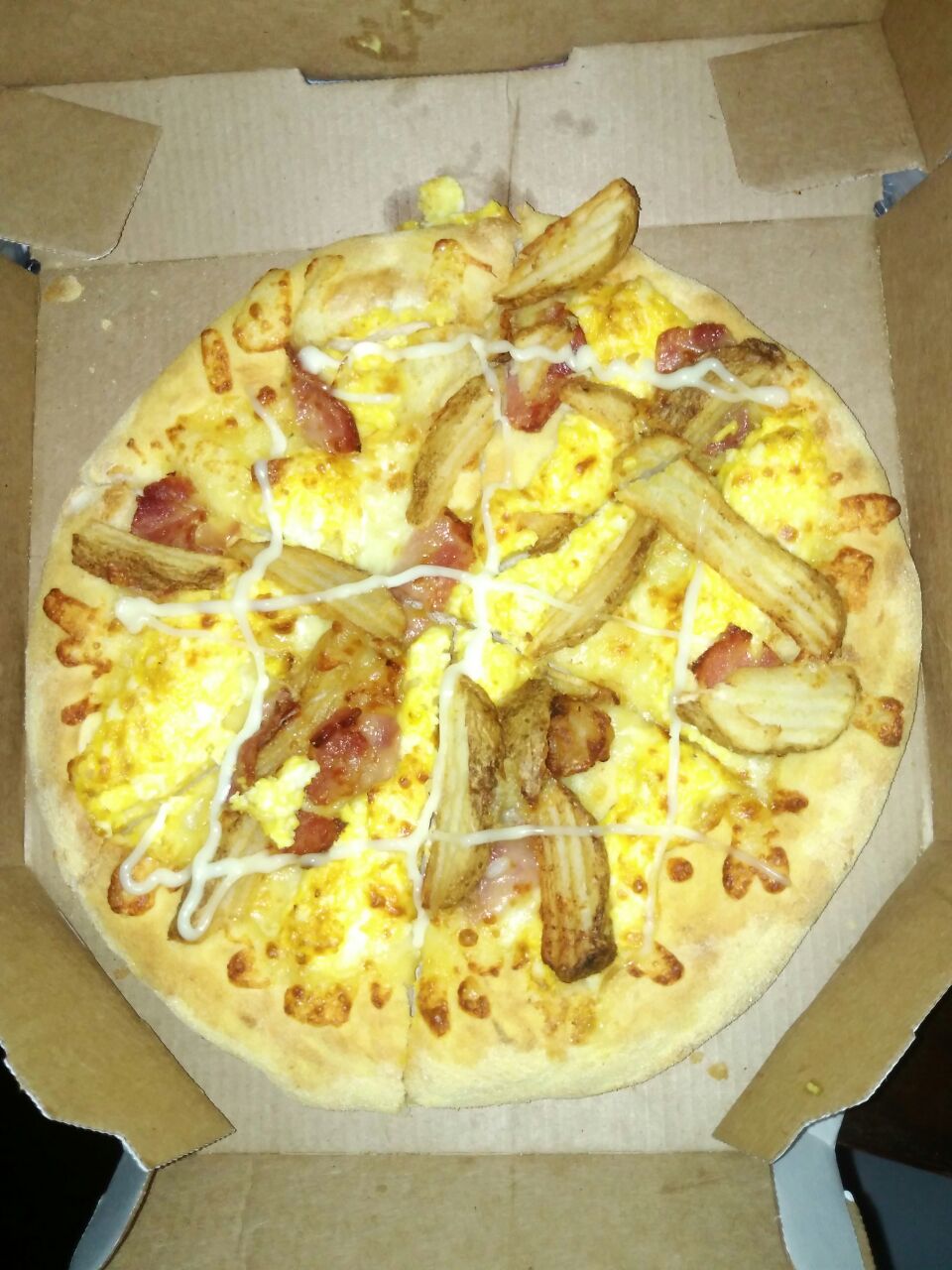 ...豆比萨没有吃过,也来试试,实际与想象的有点出入,培根不多,土豆都是薯角,中间的美乃滋感觉像炒蛋达美乐的培根土豆比萨没有吃过,也来试试,实际与想象的有点出入,培根不多,土豆都是薯角,中间的美乃滋感觉像炒蛋。面包热狗卷有点出乎意料,除了外面裹的一层面包,里面是十足的热狗肠,很实在的一根。