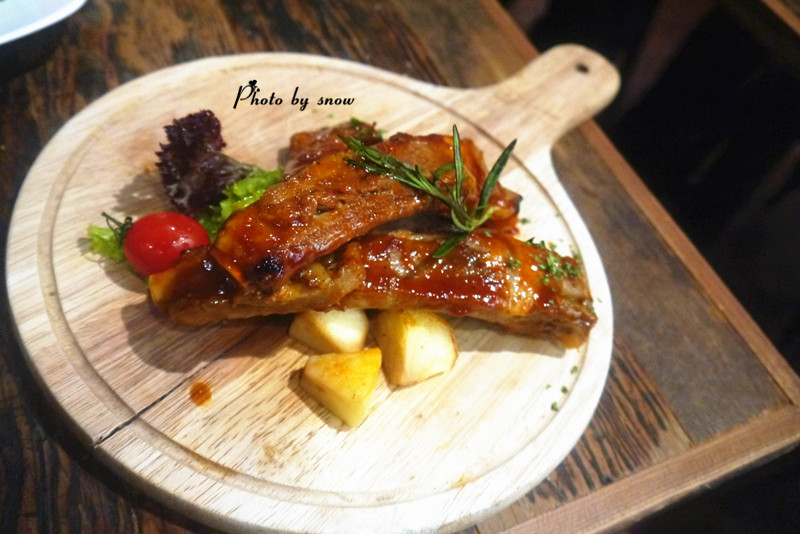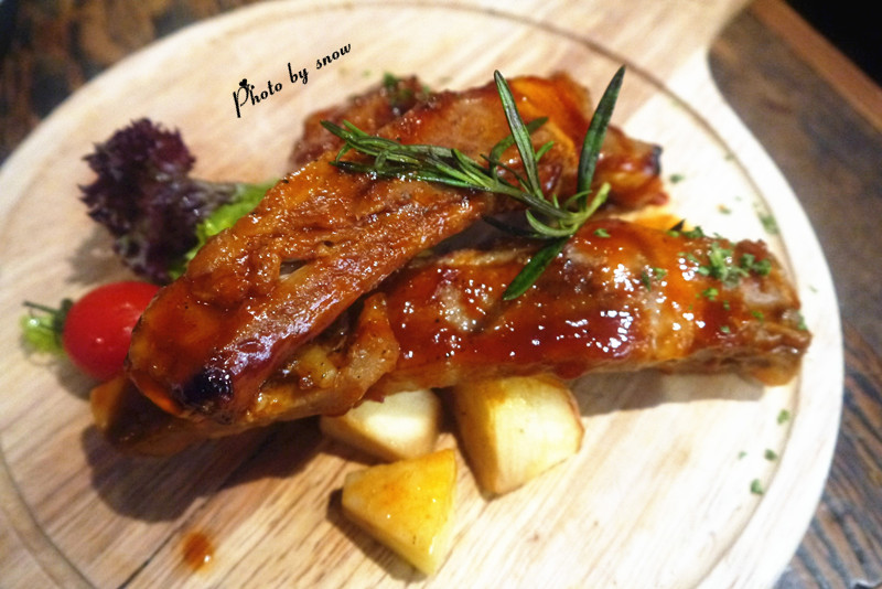 淋在上面的酱汁很好吃 【烤丹麦皇冠猪肋排】 三根色泽艳丽的猪肋排 肉已经炖的酥烂 旁边搭配的是烤苹果