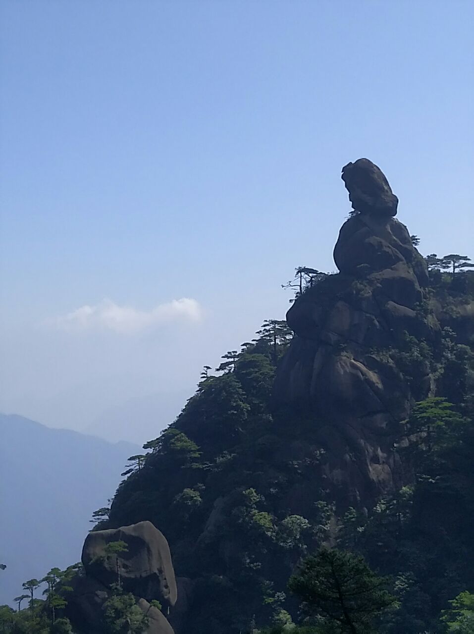 我去过浙江仙居的神仙居景区,再到江西三清山景区,味道自然是越来越好。 女神峰位于世界自然遗产----江西上饶三清山南清园景区东面,为三清山标志性景观。一度曾被名为“司春女神”,自2008年起又被称为“东方女神”。女神峰为花岗岩天然构造而形成的奇妙石峰,通高86米,面对“巨蟒出山”,朝玉京峰而立,整座石峰就像一位秀发披肩的现代端庄少女,天设地造,鬼斧神工,无论近观远眺,皆栩栩如生,形象美妙。她高鼻梁,樱桃口,圆下巴,宽额头,玉佩饰顶,秀发齐肩,莲盘端坐,风姿绰约;双手托着两棵古松,意若要使春色永驻人间。 是大自然的神奇雕塑,成就了三清山这尊美妙无比的艺术珍品!