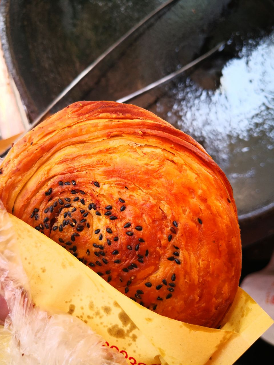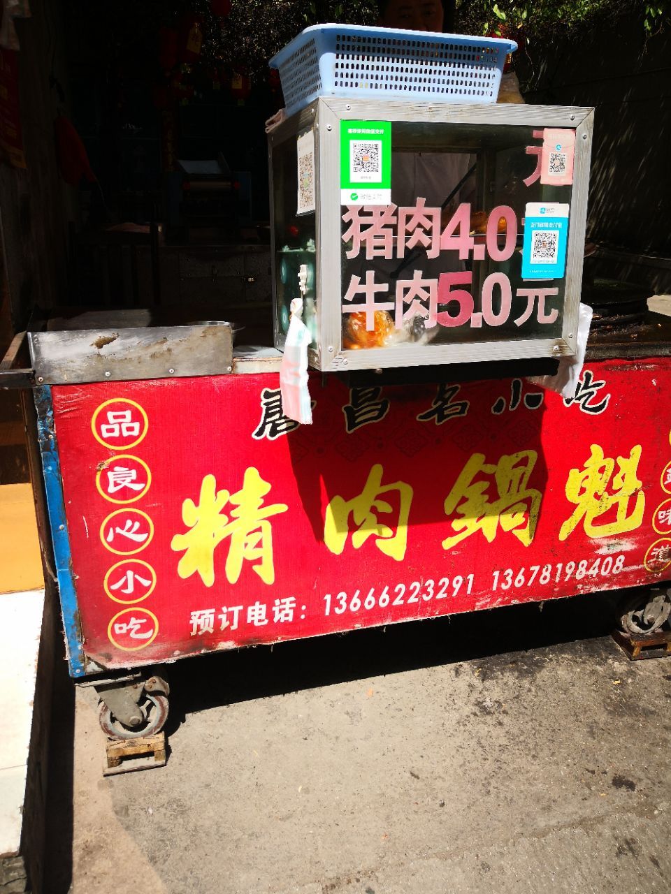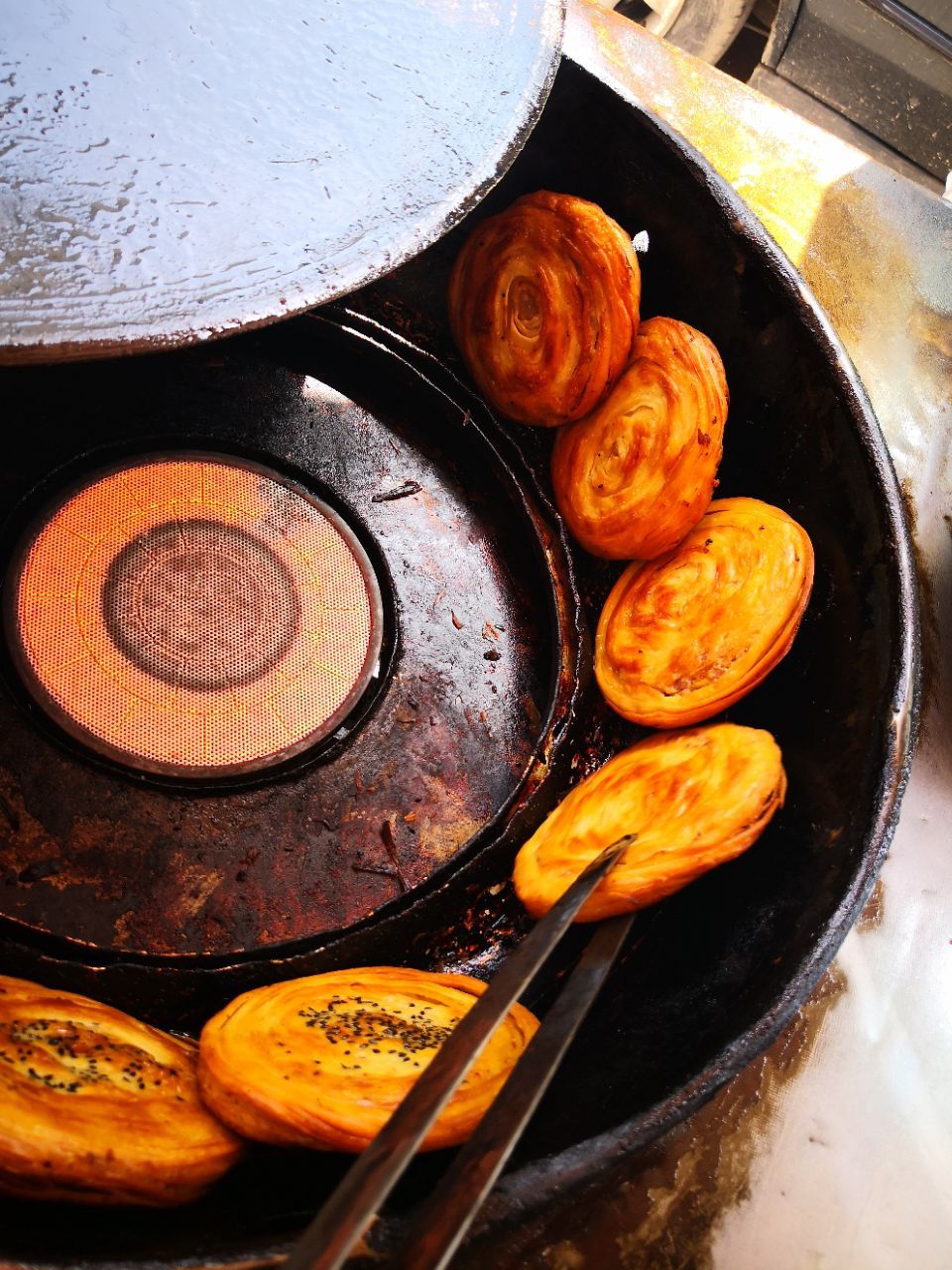 吃完粉子醪糟,我觉得我已经很撑了,正好逛一下文庙(具体内容见我下一篇的唐昌游玩篇)从文庙出来要去崇宁公园,我直奔去了公园大门的一家有名的锅盔店 崇宁公园大门的斜对面,位置好找 老板在店招上几个字 尝古镇味道,品良心小吃 因为这家的锅盔用的都是精选的肉肉 原料直接摆在桌子上,大家都看得到 运气好,我吃的刚出锅的锅盔 我猜测面是被师傅反复揉过的,因为皮非常酥,而且层次非常多,第一口咬下去酥脆的感觉仿佛在吃馓子,真的看得到里面有很多层。很安逸。阳光下,发着光。 但是,不适合打包,吃新鲜出锅的是最好吃的