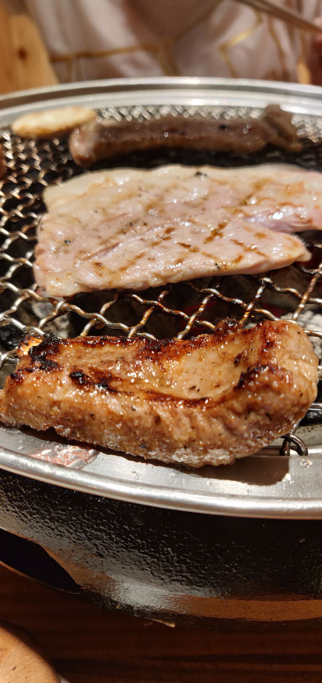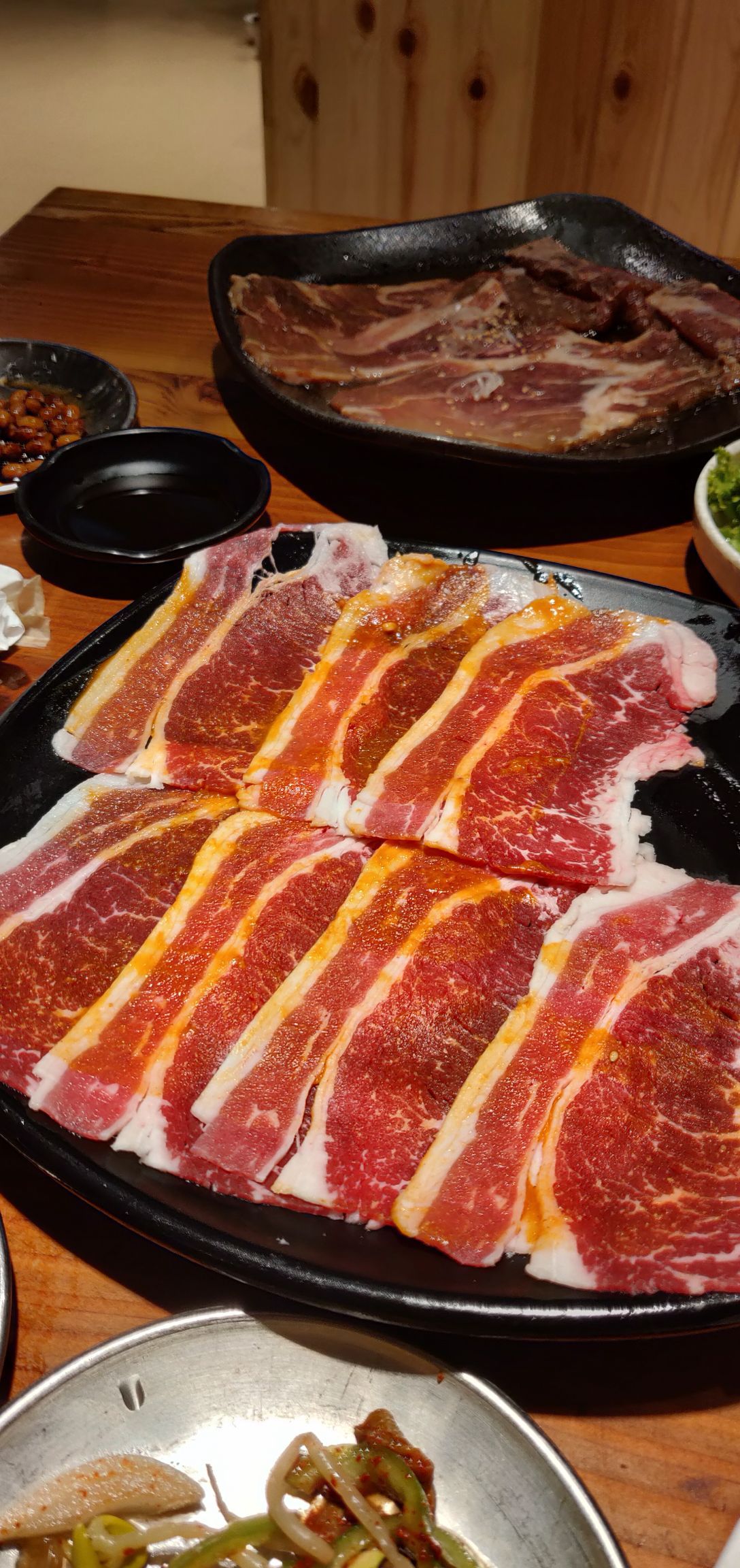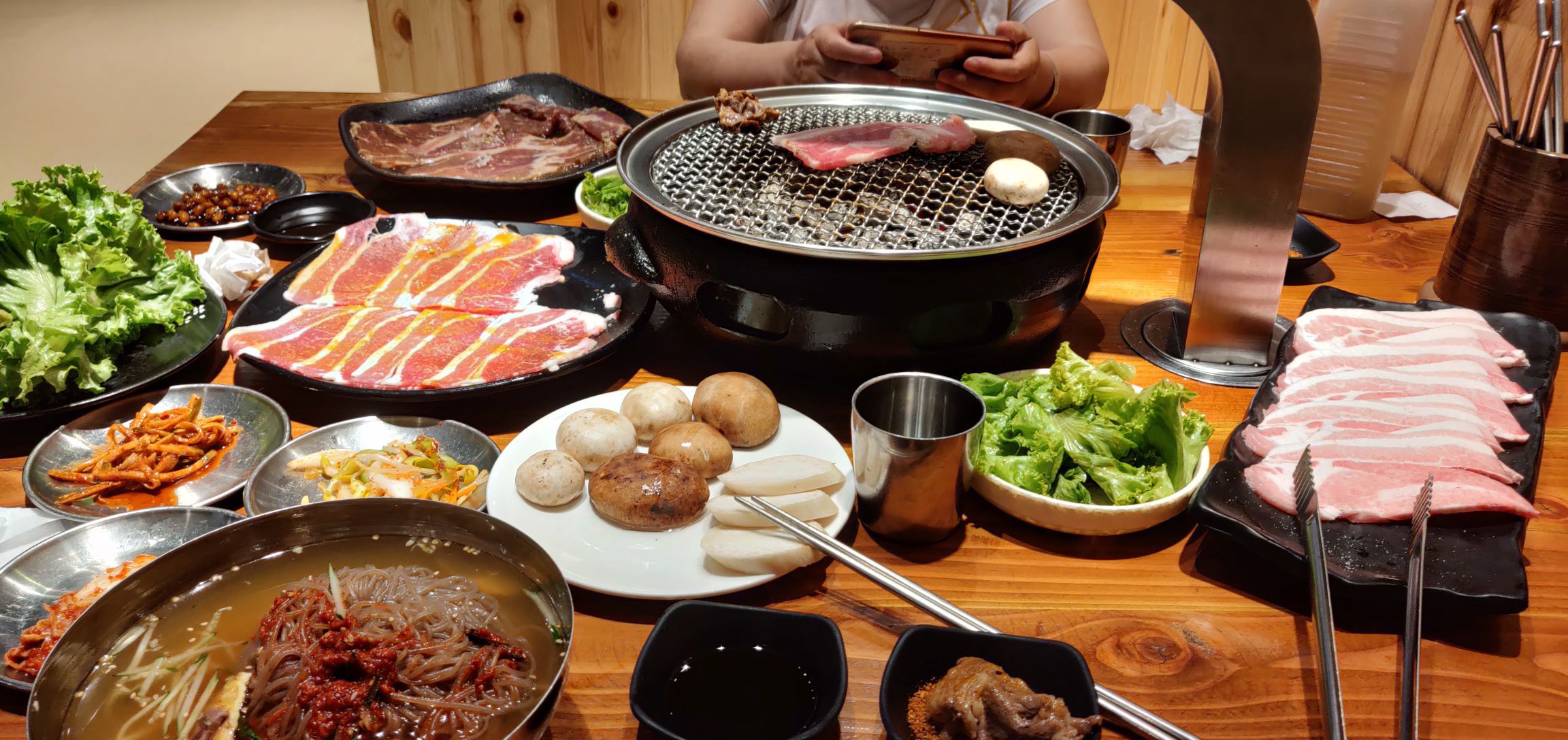 店铺就在丹东火车站旁边,我到的时候已经7点多可,人还是挺多的,等了有十多分钟,就有桌了,最后老板还给打了9折,大概是因为等了一会吧。点了猪排,特色肥牛,猪五花,菜量很大。一天没吃饭的两个人点了150块钱的东西,打了折130多,吃不完。赠送的生菜很多,不像别的烤肉店就送几叶。还有配了香油的生菜,卷着肉真的超级香。冷面是荞面的,很有特色。建议吃肉肉,要记得跟店家要一把剪刀啊,肉肉太大了。虽说一大口超满足,可像猪排这种,必须剪开吃啊。总体来说,环境服务菜品都不错的。东北菜量普遍都大,一定要量力而点啊。