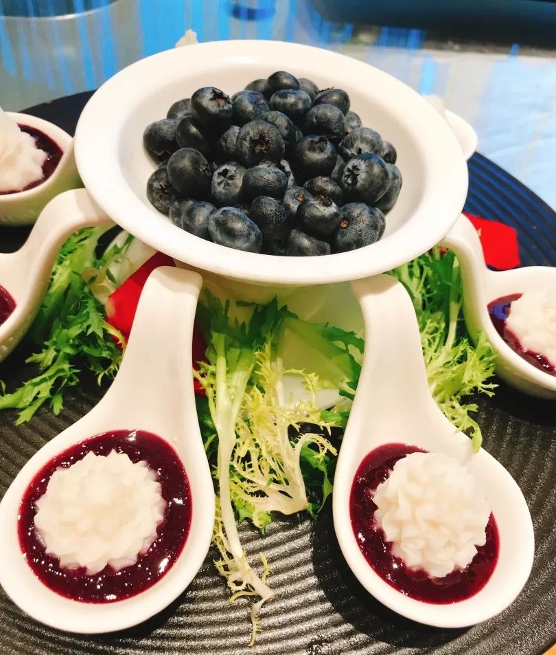 网友2018-09-02菜品都非常有质感,品质很不错蓝莓山药,用勺子装的山药泥细滑爽口,蓝莓酱口感难忘,新蓝莓整颗装饰新颖别致。青椒鲍鱼把川味融入海鲜,辣香Q弹。香煎银鳕鱼香酥化渣。菜品都非常有质感,品质很不错。