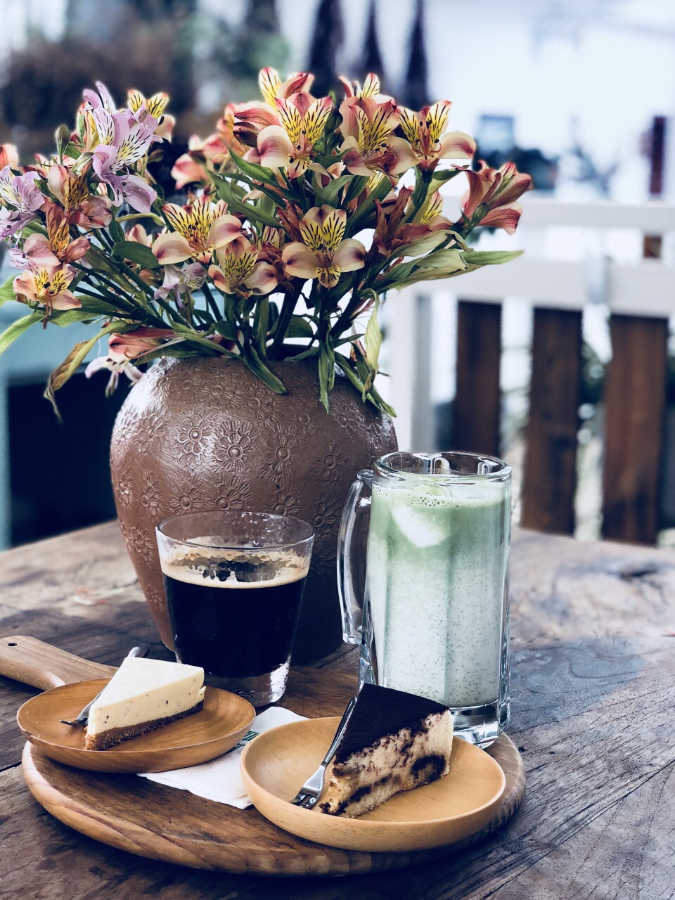 位置很好找,还是咖啡店和客栈一体的,我们点了一杯美式和一杯抹茶拿铁,还有一份芝士蛋糕和一份提拉米苏