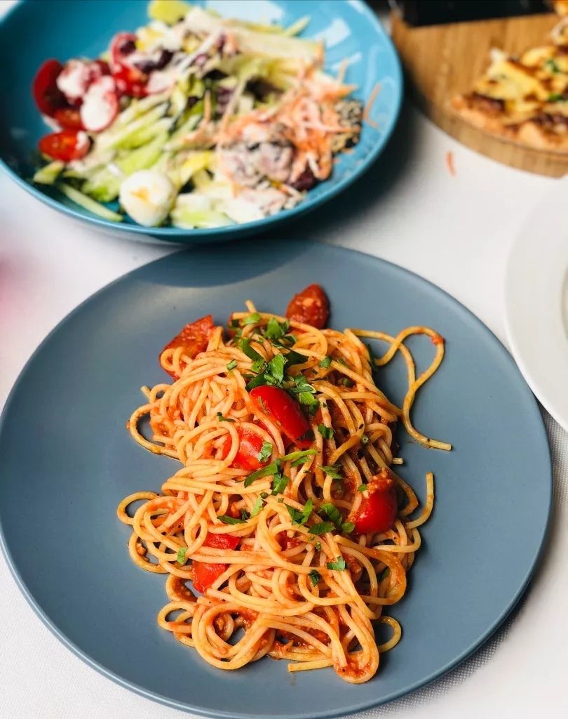 沙拉非常有诚意,用料丰富,自制的沙拉酱味道很好。 西西里番茄意面,选用的小番茄味道足,不酸,黄油炒过后成醬,意面煮的软硬适中,每根都裹了浓浓的酱汁。 意式薄底芝士土豆披萨,薄底现烤的披萨,芝士量足,芝士拉丝不错,土豆绵软,配上培根的咸香,口味一流。 牛排和蛋糕都非常的有质感,值得推荐。