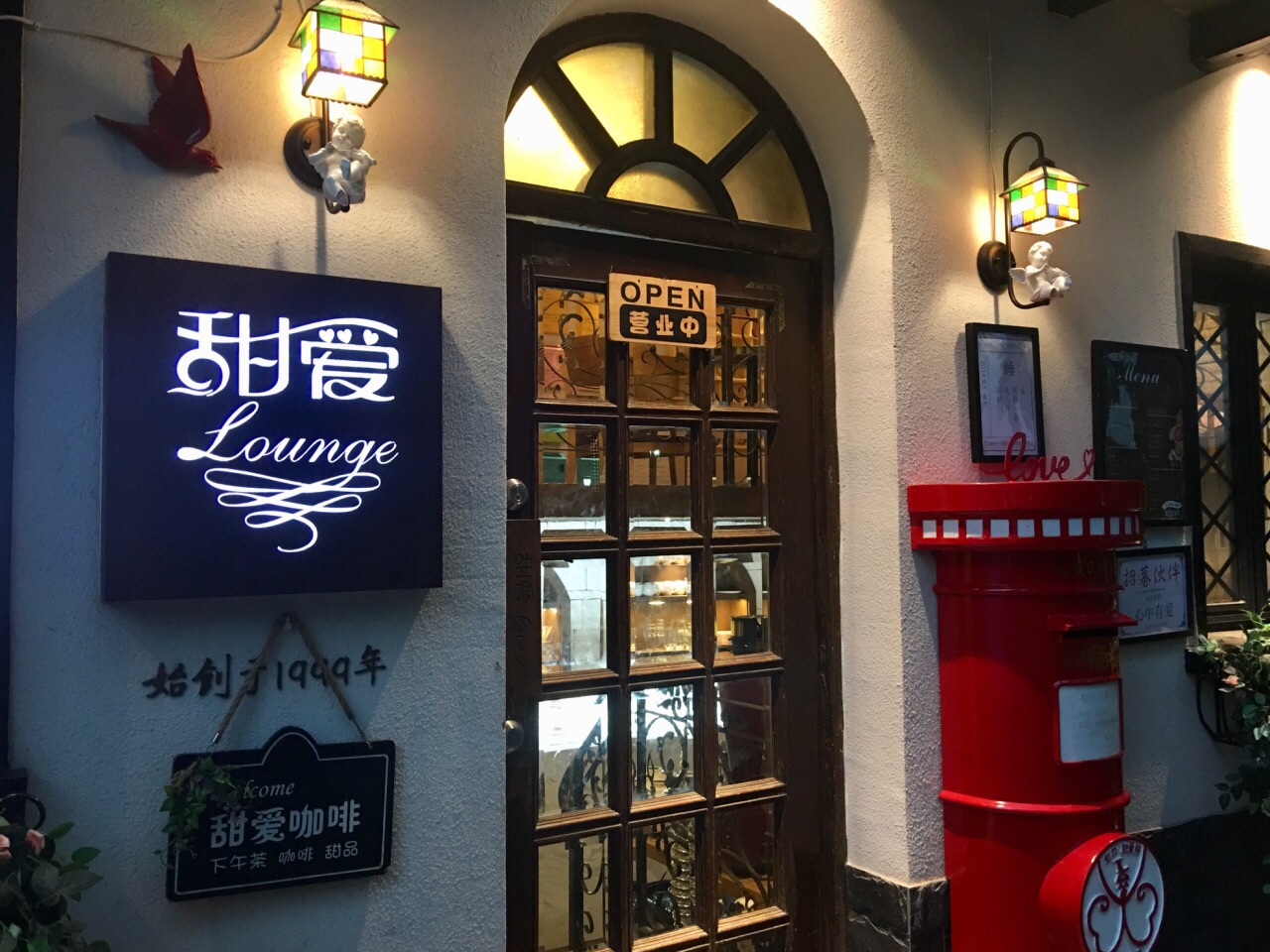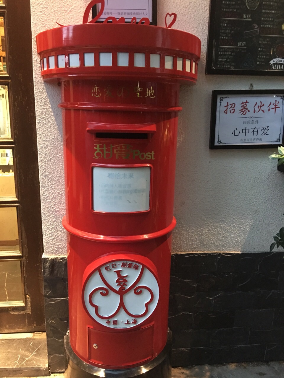 甜爱咖啡,位于上海虹口区的甜爱路上,热门的网红打卡地之一,也是好多人慕名而来的一家咖啡店! 外观是一幢两层的小屋,门口有个红色的超大邮筒,很显眼!右边的墙上还有几句话和一辆自行车和花卉组成的装饰墙,充满了文艺与浪漫!室内分为两层,店内人还是我蛮多的,各种小物件装饰的也挺特别的,还有个粉色的霓虹灯,闪着love never dies。她家的甜品和咖啡都是蛮有名的,选个午后过来坐坐喝一杯,就算一个人也是不错的享受!顺便还可以逛逛甜爱路,虽然不长,但据说是魔都最浪漫的一条马路!一定要来感受下!