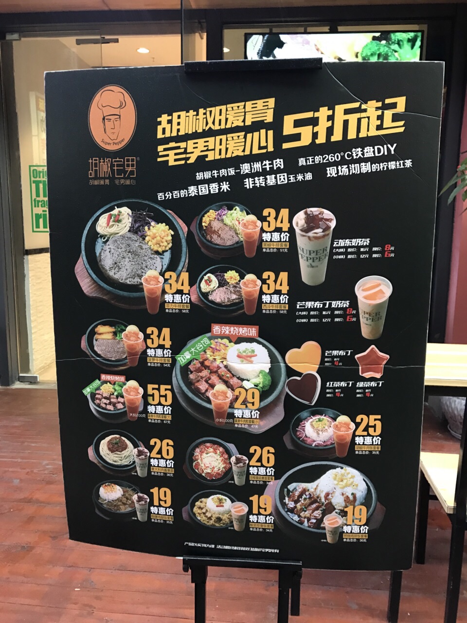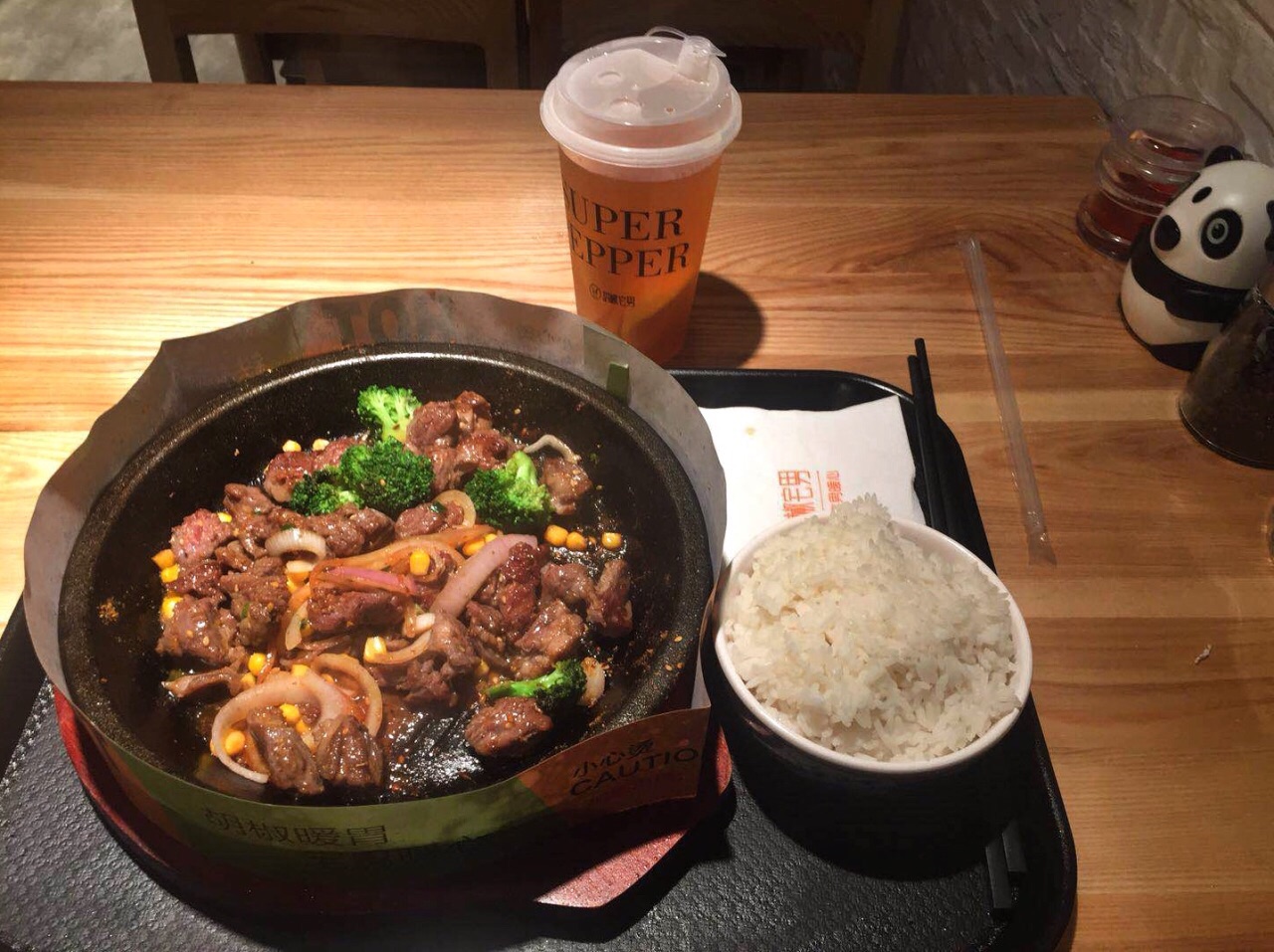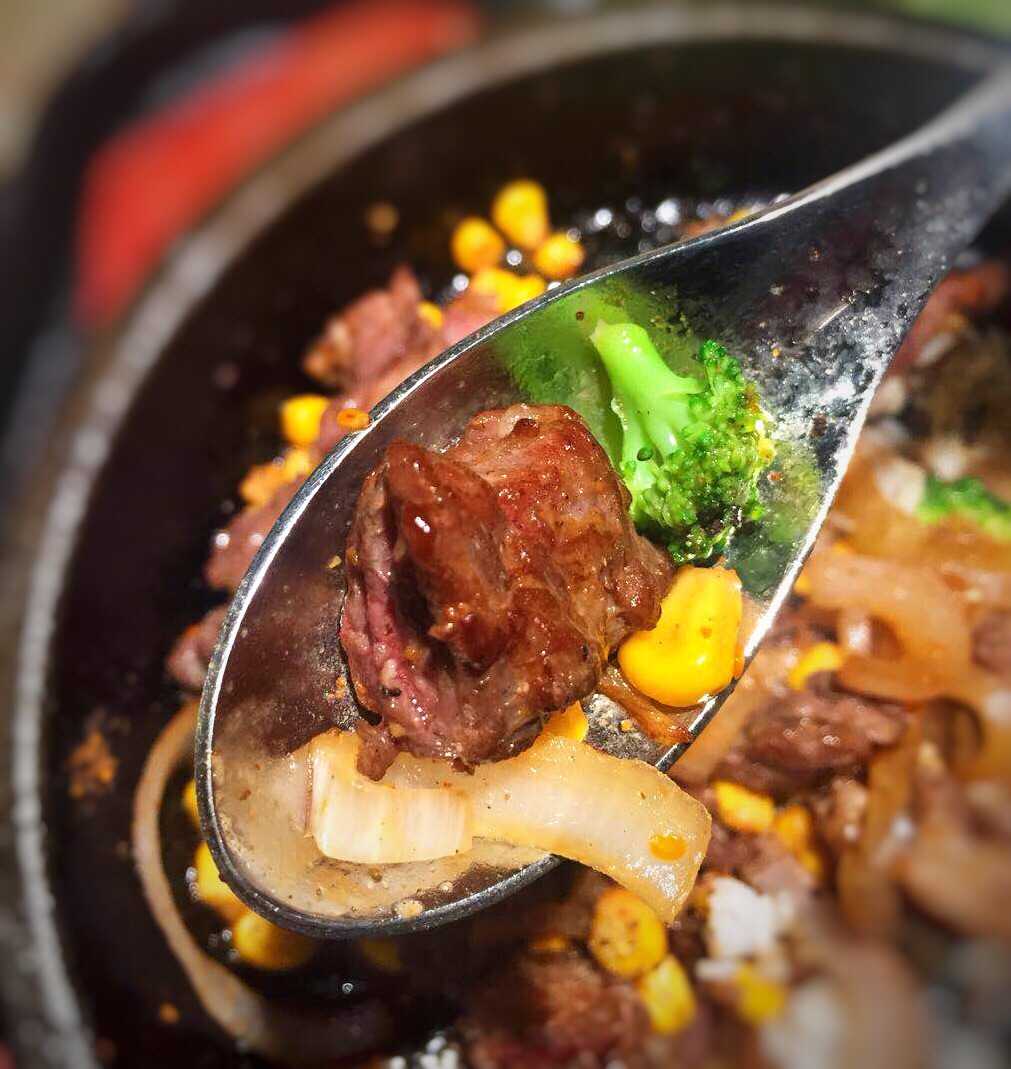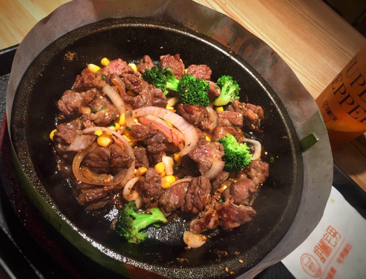 地址:集美万达金街里面沿街店面; 环境:简单舒适的就餐环境,暖色系灯光很温馨; 菜品: 有一个蛮出名的连锁店叫PEPPER LUNCH,在全球很多地方都有,也是吃铁板饭和意面之类的,这家店风格很像,味道更好; #暴爽牛肉粒套餐# 55元;内含一份牛肉粒铁板,一份米粉还有柠檬茶; 牛肉部位:应该是西冷(选用加拿大进口谷饲牛肉,西冷部位) 制作:冷切成粒,在200多度的铁板直接烹煮,更加新鲜的锁住更多肉汁,然后带着滋滋香味端上桌再供客人DIY,趁着热度均匀搅拌,让肉粒在短时间碰撞出新的味道,可以根据个人口感加入研磨胡椒或者辣椒面。 其他配菜如玉米粒选用甜玉米,配饭选择最好的泰国香米,两者搭配简直是绝配完美!味道太好了,肉粒鲜嫩可口,似乎让味蕾感受到大自然气息! 现做的柠檬水,采用天然柠檬切片制作,无糖更健康! 现在新店开张有优惠, 服务:店员热情亲切,满意;
