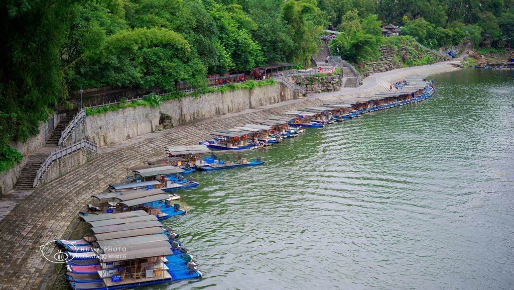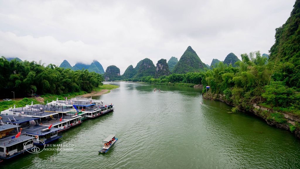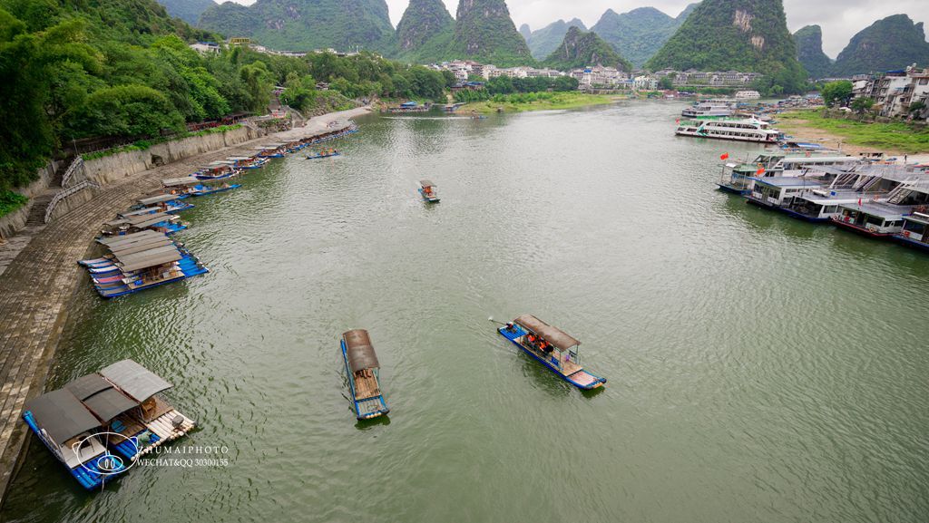 漓江上有一座长207.2米的双拱混凝土的大桥「阳朔大桥」, 是阳朔迄今为止最长的公路桥。 站在桥上,可以很好地观赏漓江风光, 一侧往漓江上游看, 碧莲峰宛如一朵含苞欲放的莲花,山旁是居民区; 另一侧往漓江下游看,隐约可见几栋房屋, 就是东街和《印象·刘三姐》的所在地。