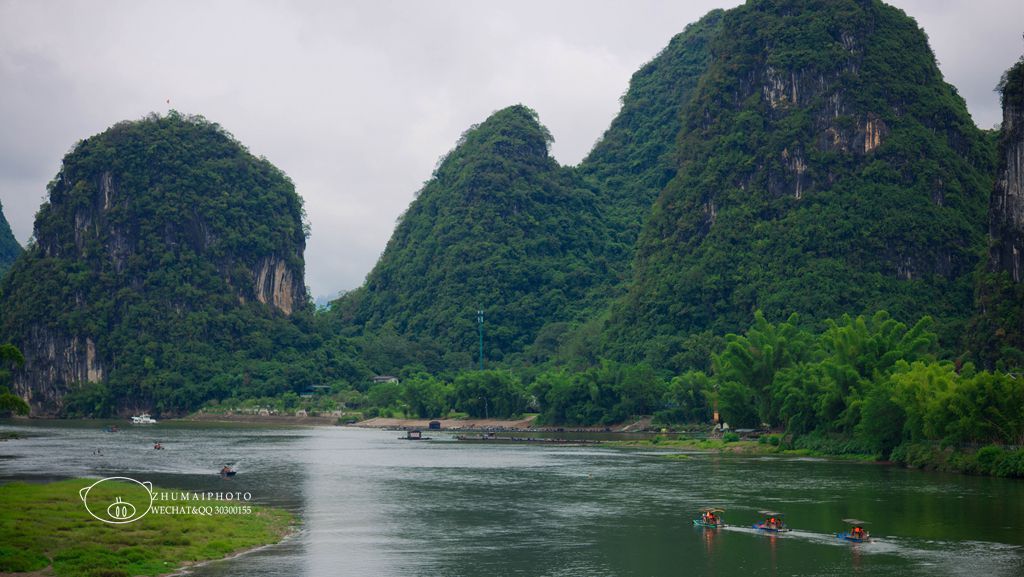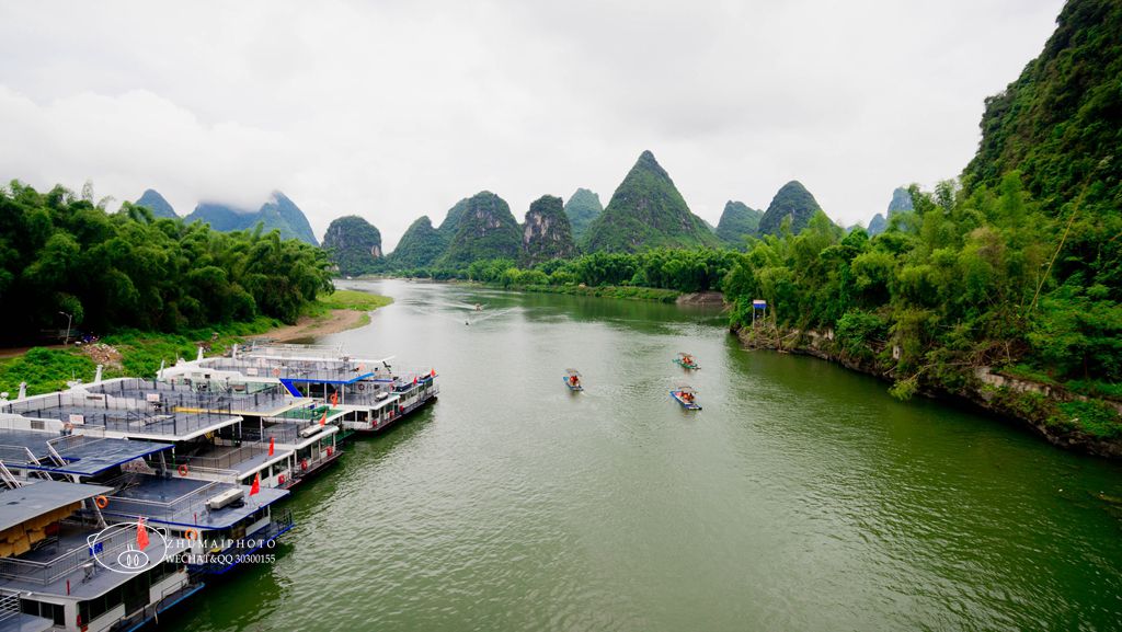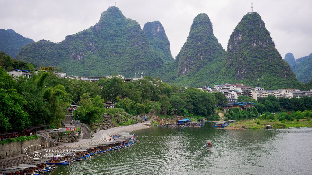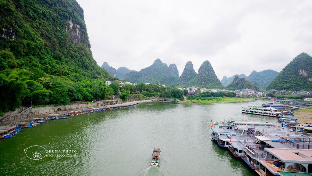 站在桥上,可以很好地观赏漓江风光, 一侧往漓江上游看, 碧莲峰宛如一朵含苞欲放的莲花,山旁是居民区