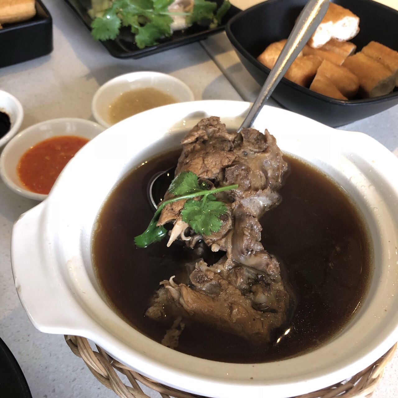 就是原来正番姜母鸭的位置,变身肉骨茶专门店,装修都没变哦~ 中午来吃个工作餐尝个鲜换换口味。 整体觉得不好吃,我的排骨肉骨茶里只有一块龙骨,汤头味浓,比较重口,不喜欢这种味儿的肉骨茶。还是原来前面那条路的新加坡肉骨茶好喝~ 鸡饭也不香。 油条也和肉骨茶不搭,粉多,比较湿软。❌ 扫描自助下单,上菜是很快的哦。
