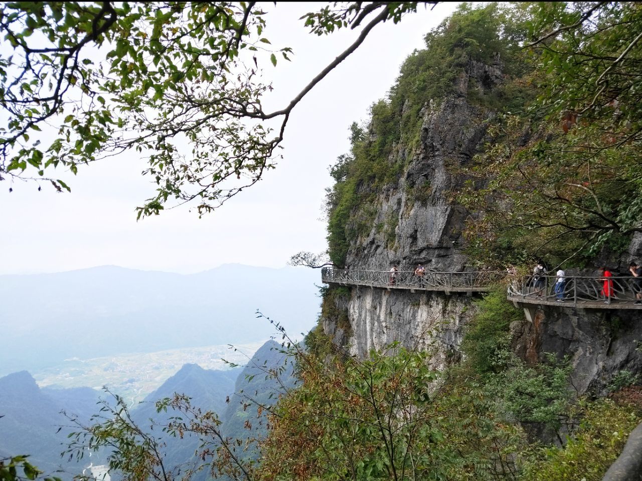 上天门山一定不能错过鬼谷栈道,有道就有景,领略天门山自然景观就要走在栈道上,一段玻璃栈道一点都不吓人,可真的碰到一个中年大叔摸着山壁打横走,不敢往下看,我看了哭笑不得,栈道往外看有些悬空感,但我觉得很自然放松,走到索桥时风很大,桥有些晃动,有些女孩子叫了起来,哈哈!