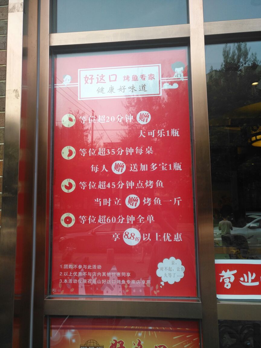 网友2018-09-07...,就餐的顾客非常多,有时候还需要提前定位,有优惠套餐可以选择烤鱼的味道不错,免费的小菜和酸梅汤这是离家比较近的一家烤鱼店,每到饭点的时候,就餐的顾客非常多,有时候还需要提前定位,有优惠套餐可以选择烤鱼的味道不错,免费的小菜和酸梅汤。