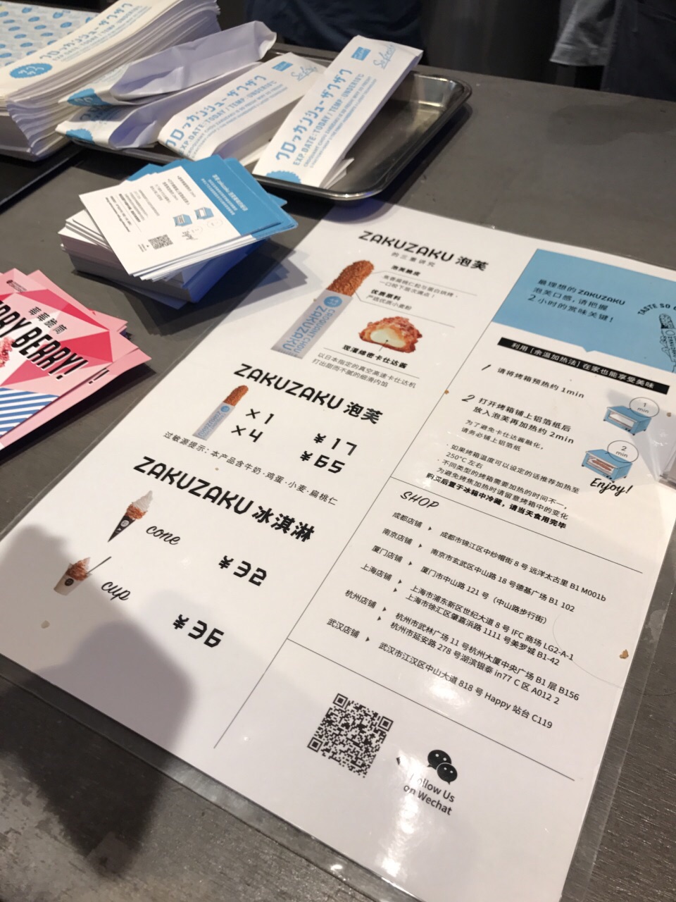 总评: 开业初期,大家都去凑热闹了,所以排队比较多。 而现在,热潮已褪,周末都很少排队了,有兴趣的可以考虑了。 味道并没有传说中那么糟,其实如果不是价格略高,是不错的。 所以嘛,相对来说,性价比偏低,卖的就是个品牌效益而已。 反正不排队,试试无妨,喜欢就再去,不喜欢就屏蔽,无所谓的。 评分:80 分 性价比:❤❤❤ 刚开业的时候我也是想去试试的,但是因为身边的朋友些都对它的评价不是很好,说什么甜腻无敌啊,根本不值得之类的。 所以我也就搁置了,时间一久就有些忘记它的存在了,这回也是看见他们家出了新口味的冰淇淋,所以才来试试。 【莓莓脆筒冰淇淋】38元 恩,完全是因为海报的颜值吸引了我,粉色嘛,女孩子好像都容易被吸引。 其实很简单,就是在原有原味冰淇淋的基础上在火炬头上淋了一层粉色的莓果酱,还撒了点果仁儿碎,吃起来略微有点儿小脆的,但是那个粉色的酱是真的 很甜腻。 难怪在我前面吃到的那个女生,咬了一口就在抱怨太甜。 忍着腻,把粉色的部分吃完,吃原味的就觉得清爽太多了,实话说牛奶的味道并不是很浓郁,只能说比一般的牛奶冰淇淋要浓一点点,但是对于它北海道牛乳这么一说,我表示质疑。 脆筒不错,脆口且蛋香味足。冰淇淋灌得很足,蛋卷部分也没有空心的现象。 【泡芙】17元 棍子形状的泡芙优点在于,即便是爆浆款也不可怕,依旧可以吃得很优雅得体。 第一口咬下去是有点惊艳的,因为泡芙外壳特别特别的脆,还有颗颗坚果的香,很不错。 只是泡芙外壳似乎厚了些,现灌的卡仕达酱太少了点,吃起来虽然略有爆浆,但是并不过瘾。 所以啊,建议把泡芙做得稍微薄一些,多给馅儿心一些空间,那样吃起来才会更满足呀。 味道嘛,还行,只是卡仕达酱稍微稀了点,可以更浓稠香醇一点就更好了。 恩。我是周天下午去买的,前面有4、5个人在排队,从我之后就不排队了。我感觉我就是排队终结者,每次就是我一去就不排队了,直到我走都没人,真的觉得自己每次都消费得不是时候。 出品稍微有点慢,态度还不错。