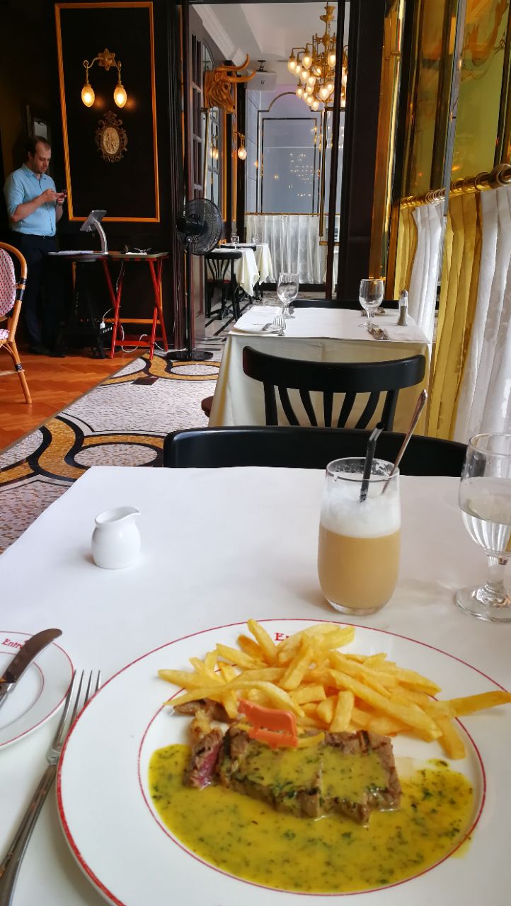 想再来一直没有机会,终于八月下旬的一个中午又来到这里,发现有新的工作午餐套餐了,牛排分量不如晚上的,但我是觉得正正好,特别是考虑到餐前面包和薯条都可以无限添加,其实吃下来什么都不加正好。换了个朝南的位置,看看室外的蓝天和座位,可惜只有春秋天才有坐在室外的可能。服务很殷勤,分寸掌握的不错,法国南方人老板,上海话说的很好,第一次接触听了他的上海话脑子转不过来,还在想是那句法文呀,为什么一个单词也听不懂。总的来说,这里给你的感觉是优雅、舒适,适合亲朋好友几个小聚说说话
