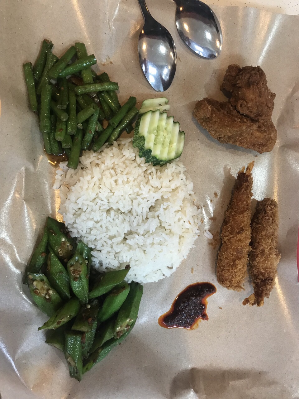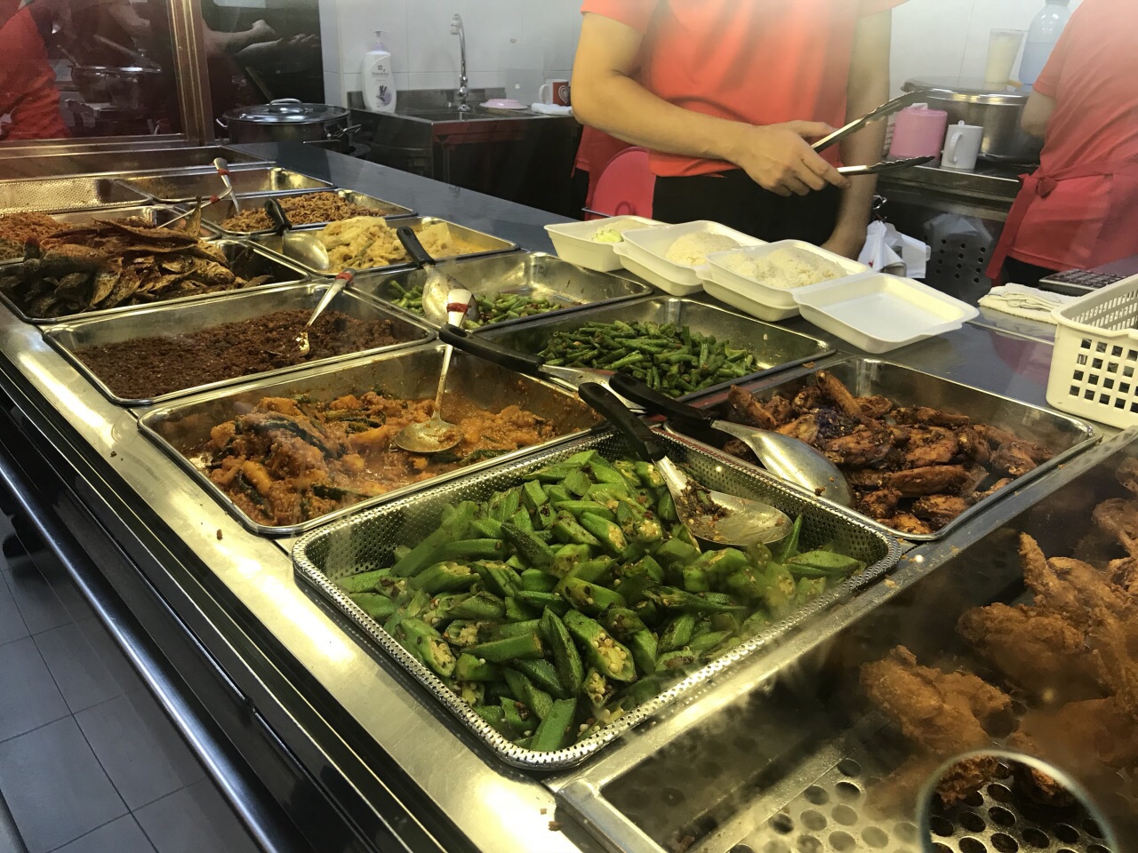 经过一天的哈芝巷、科学艺术博物馆、漫威展、金沙湾夕阳+烟花、幸福摩天轮后,果然还是会累会饿的,晚上10点亲戚们带我们来到吃椰浆饭的地方。其实对椰浆饭的印象,更多来自马来,只觉得加了椰浆很香,这里也确实如此。 这家店很家常、很local、都是当地人的感觉,即使晚上10点还是得排队,看到其他评价说正餐点排长队,看来是很受欢迎了。 形式有点类似快餐店,摆了一大堆盘子装的菜。用一张纸(油皮纸)放盘子上,米饭和菜放在上面。 本来不怎么抱希望。但是秋葵和四季豆真的很好吃!不是炒的很烂的那种,有点Q脆,又加了点东南亚风味的调料。 炸虾条和鸡翅就比较中规中矩了,味道也还可以。 东南亚风味和中华料理的完美结合!推荐!