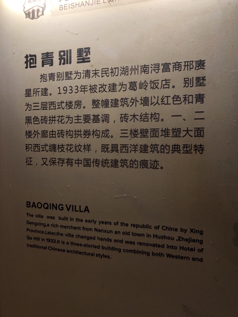 抱青别墅,该别墅建于1907年,主体建筑为典型的欧式风格。1929年被西湖博览会借用,为工业第四馆,建国后曾作民居使用,曾经这里是一个会所,成为达官显贵的餐厅,2013年开始清理整顿会所,取消餐饮并开放给公众参观,现为杭州国画艺术展示中心。