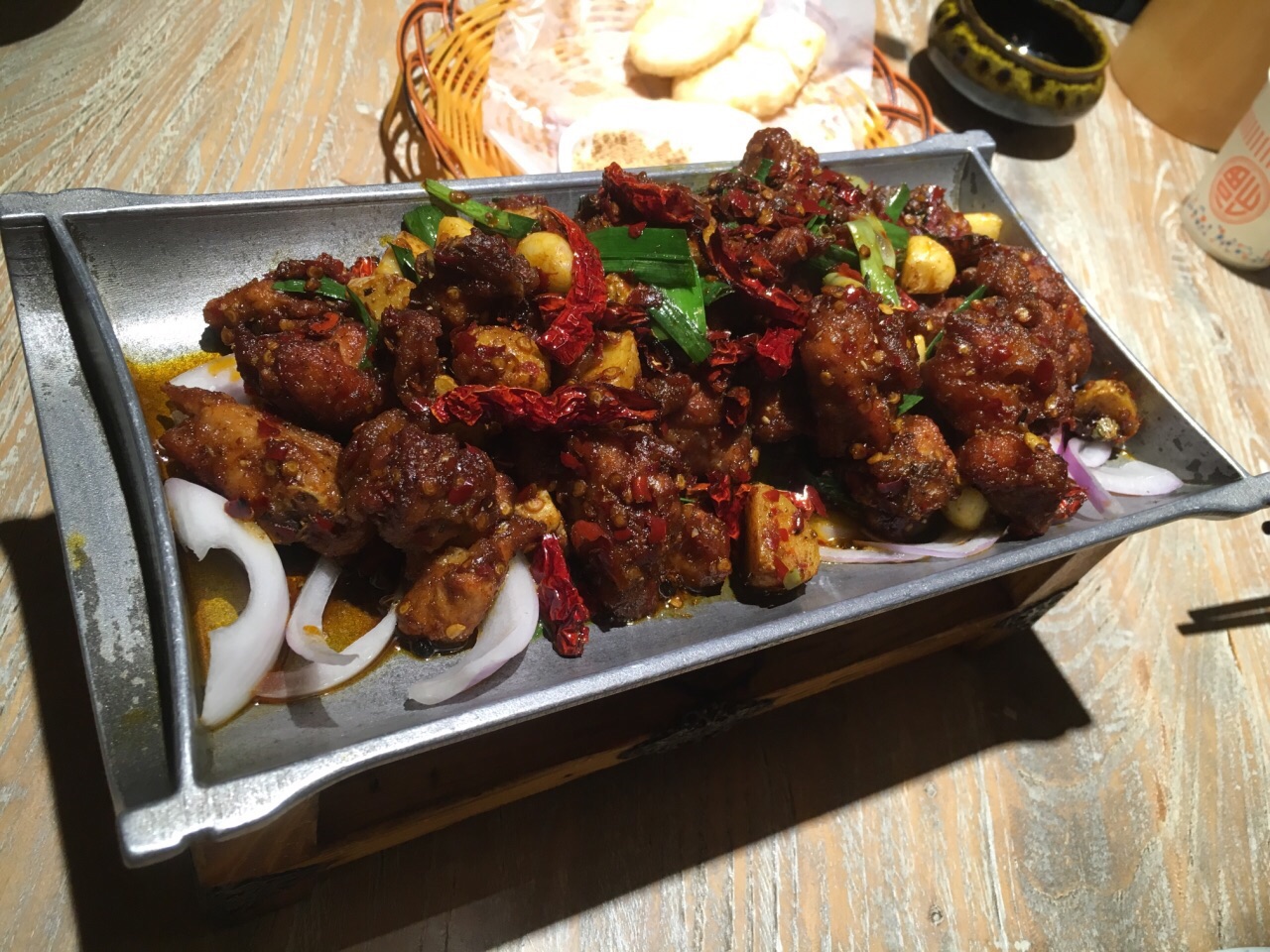 大十字排名第一的推荐,就在酒店楼下,果断拔草! 晚上生意很好,不过不用等位。有鸟笼的装潢,挺好玩。 辣子鸡,其实菜单上叫火焰鸡,口味已经改良,不是小时候的味道了。不过还不错~ 风味糍粑,外面有裹薄薄的蛋清,很香,很糯。蘸黄豆粉,太赞了! 牛心菜炒猪油渣,和手撕包菜不一样的烧法,有点酸酸的,不辣,很喜欢! 山竹笋炒肉,最后上的,有点冷掉了…估计生意太好,一直没端上来。其实还是蛮好吃的,山竹笋很嫩,肉片也很嫩很入味。稍稍偏咸了点… 免费送柠檬水,很好喝!不过没有餐厅纸…贵阳好像餐厅一般都不给免费的餐厅纸… 支付宝可以97折,还是挺超值的!