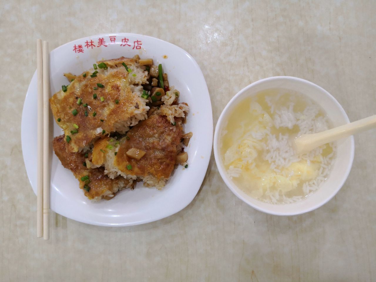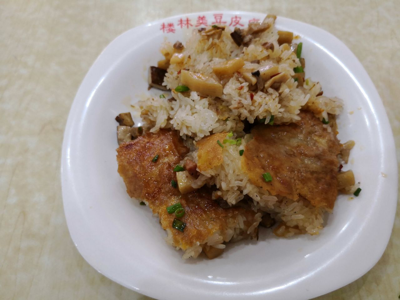 楼林美豆皮,在江汉路洞庭街上,店老板是马师傅,至今已有二十余年的历史了。小份三鲜豆皮六元,蛋酒两元五角,便是一顿丰盛的早餐。 豆皮,皮子漂亮如霞光,煎的焦脆,糯米软硬合度。牛肉丁笋丁香菇丁炒制入味,总体味道不是老通城的清雅系列,而是带有湖南的重口味,这是因为师傅在铺上糯米后,往锅内加了两勺秘制红油,咸鲜。需要用蛋酒来冲口。 看店内招牌,还有朝阳春牛肉面,味自湘西,也有遵义牛肉粉,或许这大概是楼林美口感有点咸香微辣的缘故,抑或马老板的豆皮受到了湘黔之影响? 楼林美就餐环境在早餐店中还是不错,且有蛋酒、牛肉粉面、米粥之搭配,我记得在罗森还见过楼林美的豆皮,可能是武汉豆皮名店中首先进入便利店的。缺点是豆皮的皮子不是现做,是提前烫好带来的,这个要大大减分,在汉口较严老幺与三镇民生甜食馆差太多。