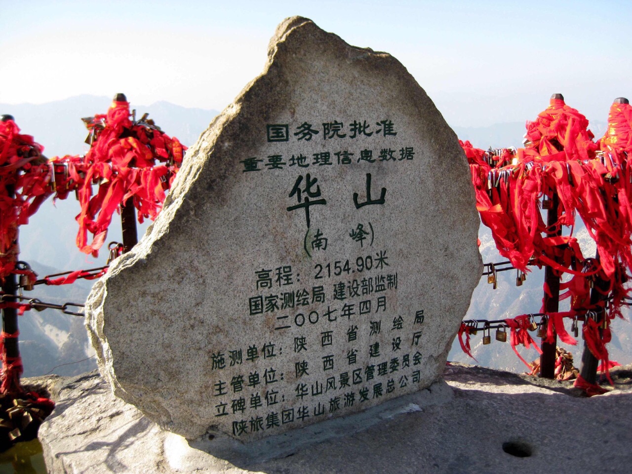 南峰是华山最高峰,也是五岳最高峰,古人尊称它是“华山元首”南峰是华山最高峰,也是五岳最高峰,古人尊称它是“华山元首”。登上南峰绝顶,顿感天近咫尺,星斗可摘。举目环视,但见群山起伏,苍苍莽莽,黄河渭水如丝如缕,漠漠平原如帛如绵,尽收眼底,使人真正领略华山高峻雄伟的博大气势。
