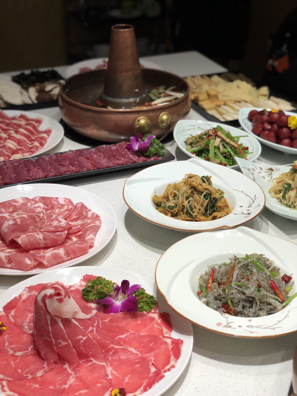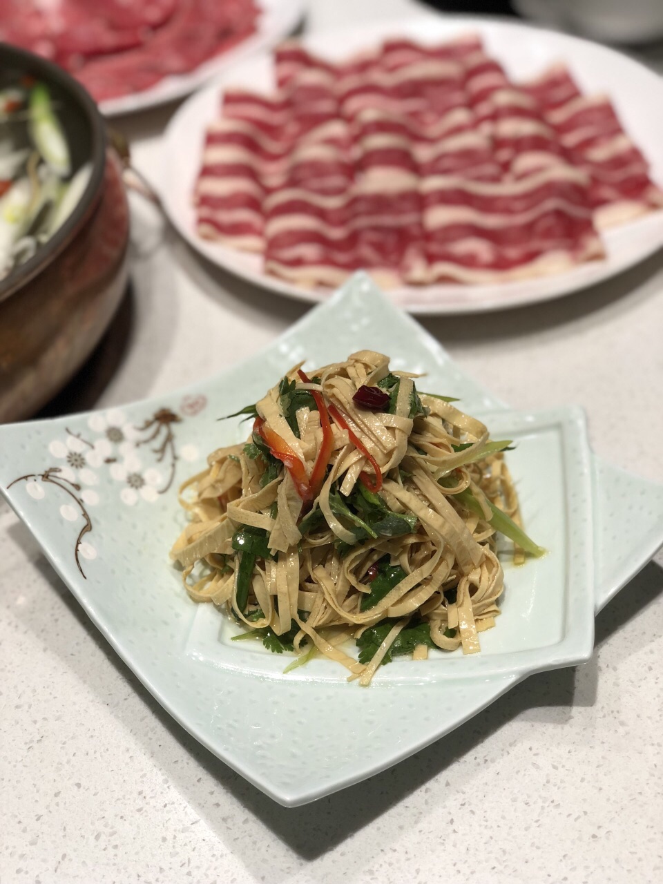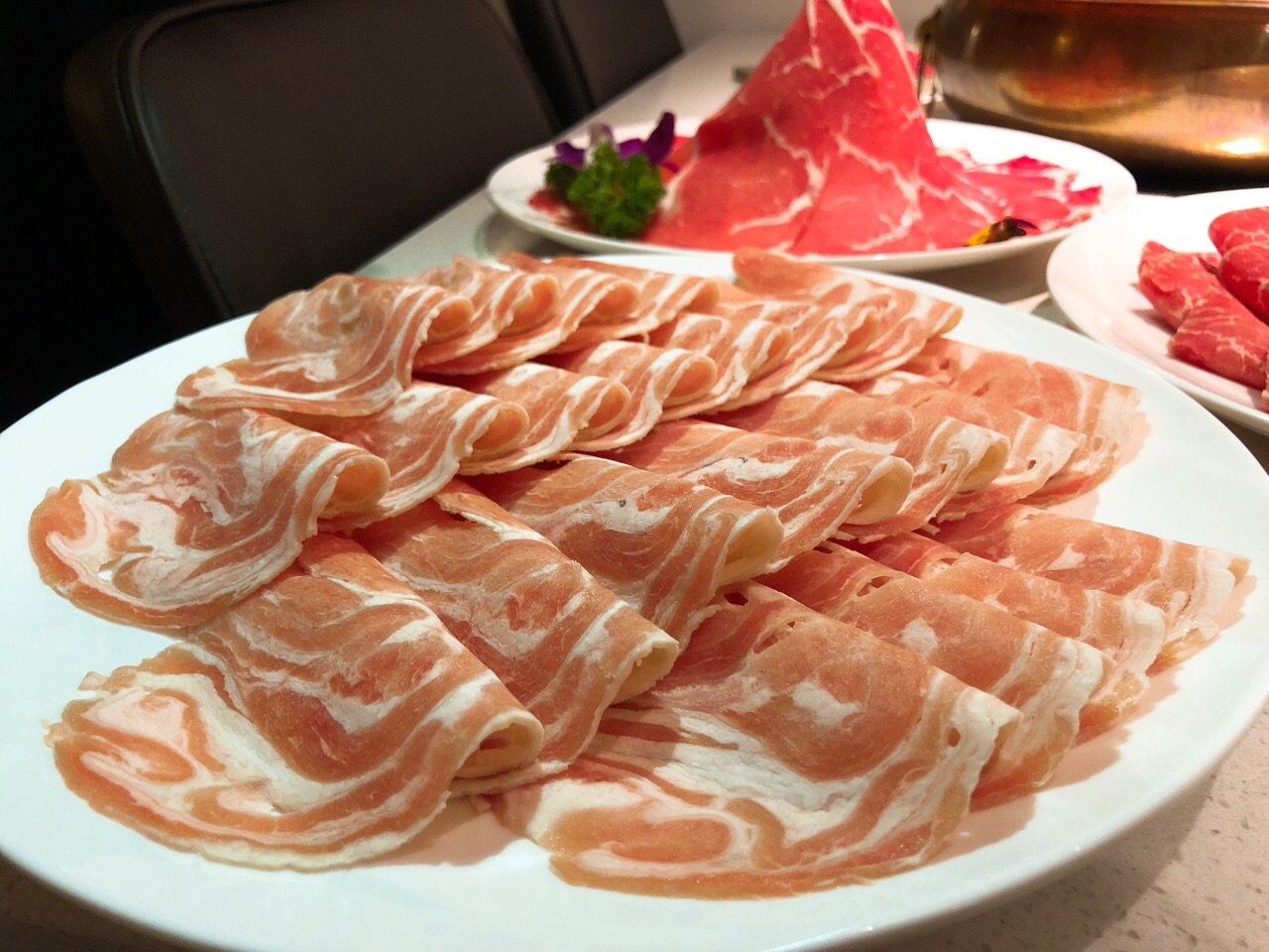 一场秋雨一场凉,不如吃点涮肉暖暖胃? 种草了这家好久,终于开到了单位门口,大都荟店,这不赶紧来拔草啦! 治愈系的简洁风,原木色装修,透明玻璃窗,大理石白餐桌,一览无余的美好,我的style~ 吃货都知道好肉一定要吃京式清汤锅,这才能吃到真正的肉香!开锅前加清水,锅底料加的大枣、姜,枸杞,葱段等,没有多余的调味品,能最大限度的保证涮肉的鲜美! 雪花牛肉、安格斯肥牛、羔羊上脑……现点现切的,超大块超厚,雪花牛肉奶香奶香的,安格斯肥瘦相间,佳佳最爱的还是澳洲和牛,当之无愧的牛肉战斗机,5秒涮肉,柔、软、嫩、香,一整片沾着咸香的芝麻酱放进嘴里,一口一口接一口,真心赞! 肉棒棒哒,凉菜也不错哦,尤其是凉调面筋,吃出小时候吃宝鸡擀面皮的味道,听说凉菜师傅是特意请的,怪不得一下子让人连吃两盘!还有一款娇艳欲滴的红色小可爱,甜酸味道却是蔬菜做的,至于原材料是什么,你们尝一下就知道啦~ 高新大都汇3号楼