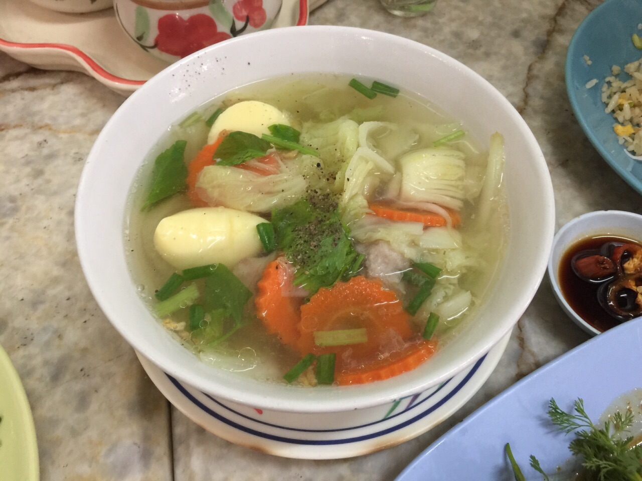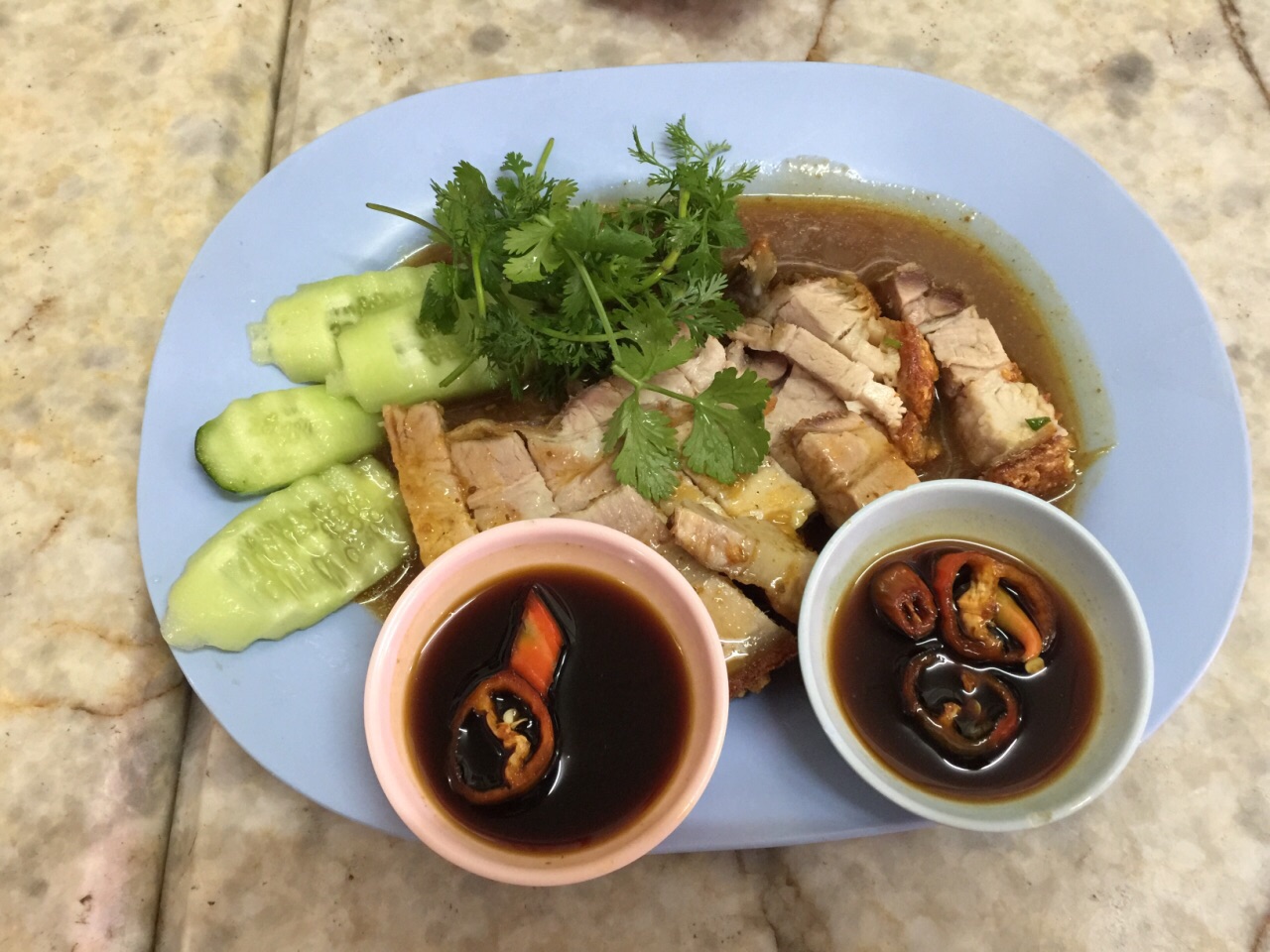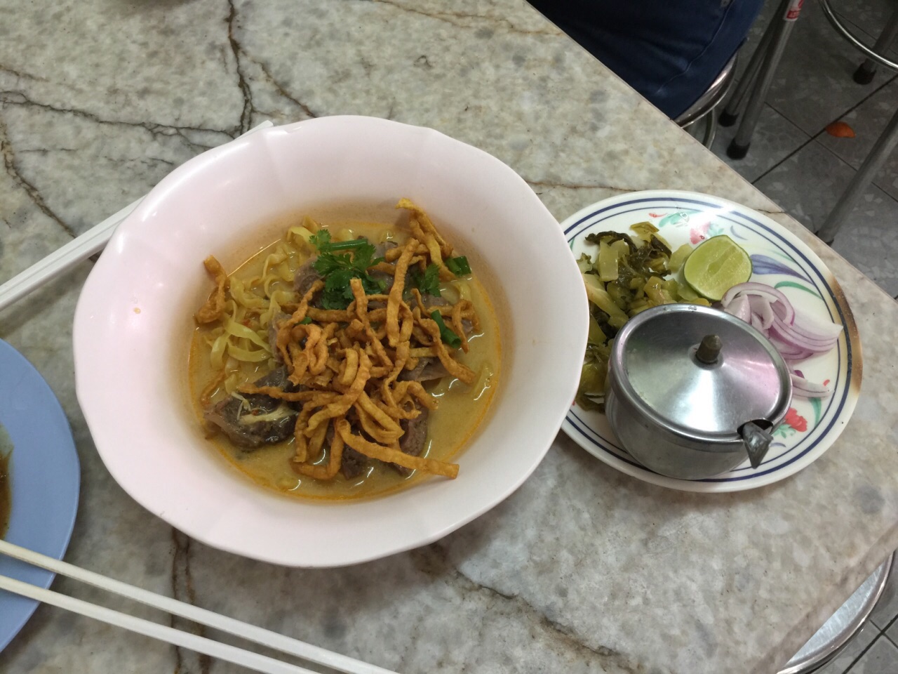 这家店在清迈大学的正对面,门面看起来非常普通,但是附近居民来这里吃饭的很多,可见这家餐厅其实是不错的。 点了泰北咖喱面、炒饭猪肉汤、猪颈肉,炒了一个绿叶菜,价格都比较便宜,味道中规中矩,虽不惊艳,但足够地道。来这里吃饭,除了吃一顿好吃不贵的饭,也能体会一下当地人的日常生活。 这里的菜单还标注中文,虽说有些翻译有些奇怪,但是每个菜图文并茂,大家应该能看懂。