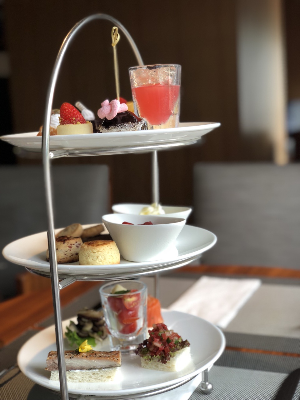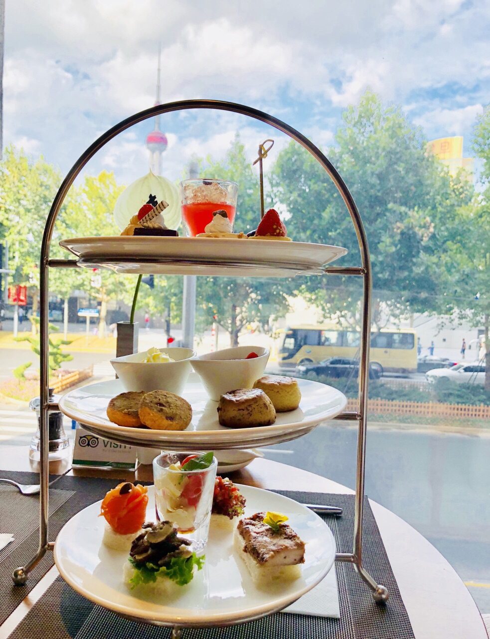 周末晴空万里,好友约着去商旅酒店喝个下午茶。地标一级棒,对面就是外滩,有着无敌江景。东西餐厅环境还不错,人不是很多,室内的静谧和外滩的人潮涌动对比,这里就显得更舒适了。英式下午茶,三层,咸甜交错的,带茶水,用的是川宁茶包。个人偏好咸点,金枪鱼塔塔不错吃,另外司康饼做的mini size,加上cream和蓝莓酱也挺好吃。品种不是特别花俏,还是蛮实在的。2人分享正好!~