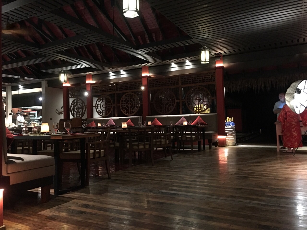 菲诺芙岛上的中餐厅,周五晚上去吃了套餐。 主菜还可以,牛肉做的不错,胡椒虾还挺新鲜的,空心菜特别不错菲诺芙岛上的中餐厅,周五晚上去吃了套餐。120每人,着实昂贵。前菜的点心都不好吃,包子没馅,水晶饺皮厚,北京烤鸭的面饼超级难吃。 主菜还可以,牛肉做的不错,胡椒虾还挺新鲜的,空心菜特别不错