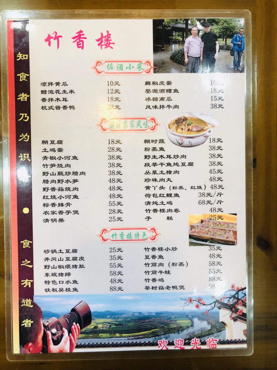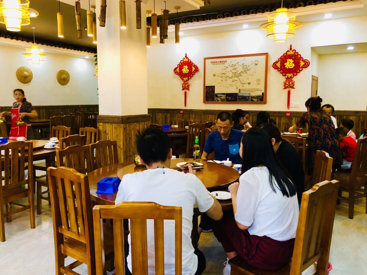今天走了四个景点消耗了不少卡路里,晚上就在酒店附近找一家农家乐菜祭下五脏庙。进门了才知道这家原来也是导游推荐的一家店。门口还竖了店主和冯小刚的合影,anyway,我只是来吃饭而已。根据老板娘说这家店已经开了有九年左右了。从装修风格上来看呢也属于比较简约的,但是跟周边的饭店比起来说还是比较新的,应该是新装修过不久。拍黄瓜,微辣型,其中有一段不太好吃,其他还可以。水煮野生鱼,放泡椒了吧,黄辣丁,有点刺,中辣,小伙伴居然喜欢吃里面的汤汁拌饭。炒螺丝,应该是下酒菜,唆起来不太困难,每只螺丝屁股都剪掉了。糊豆腐算是地方特色菜,因为前面吃的比较重口,后面就尝不出什么味道了,加了米粉的豆腐,吃起来味道比较奇异。安利清蒸红鲤鱼,鱼肉是改过刀的还比较入味,非常的鲜嫩,价格不贵,50块都不到一条。手撕包菜就是香辣味,一般。韭菜炒蛋中的韭菜老了点!米饭吃起来比较粗糙,咽不下去的感觉。总体性价比还不错,老板娘服务态度还ok。