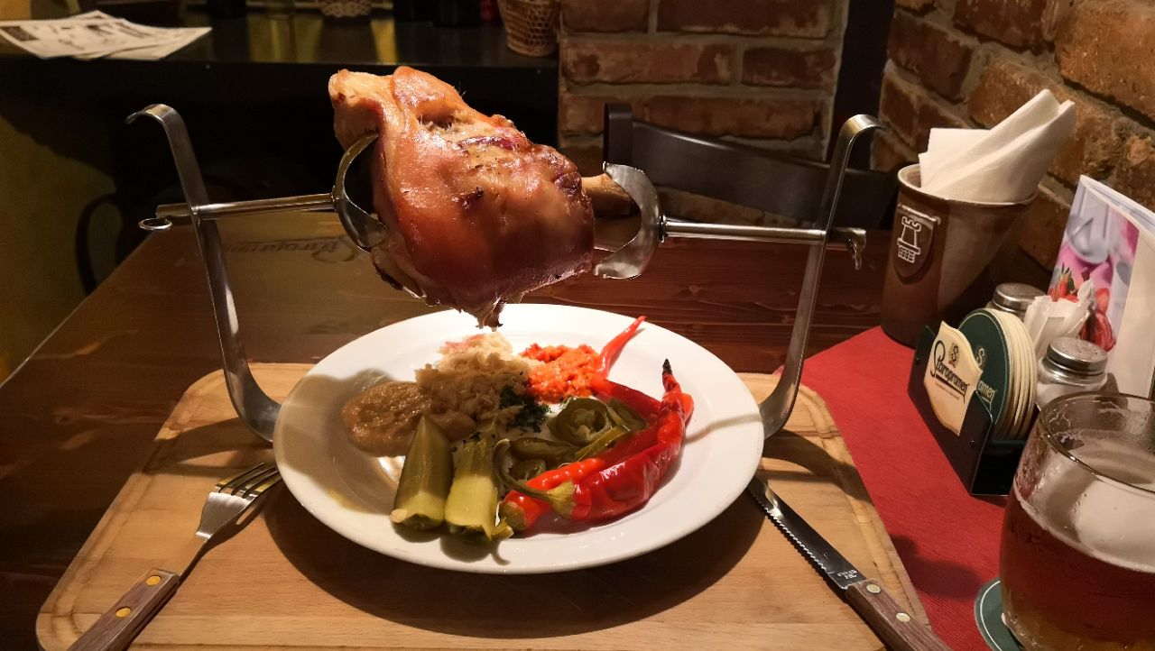 因离下榻宾馆很近,慕名而来。烤猪肘味道没得说,就是太大一个人吃不完。加上啤酒饮料及服务费,折合人民币90元,性价比确实很高。 也许是慕名而来的中国人多了,感觉服务不很耐烦。结账时还专门写了一个催要小费的纸条,感觉很不爽。其实他不提我也会给一定小费的,即使我知道在捷克付小费并不是必须的。