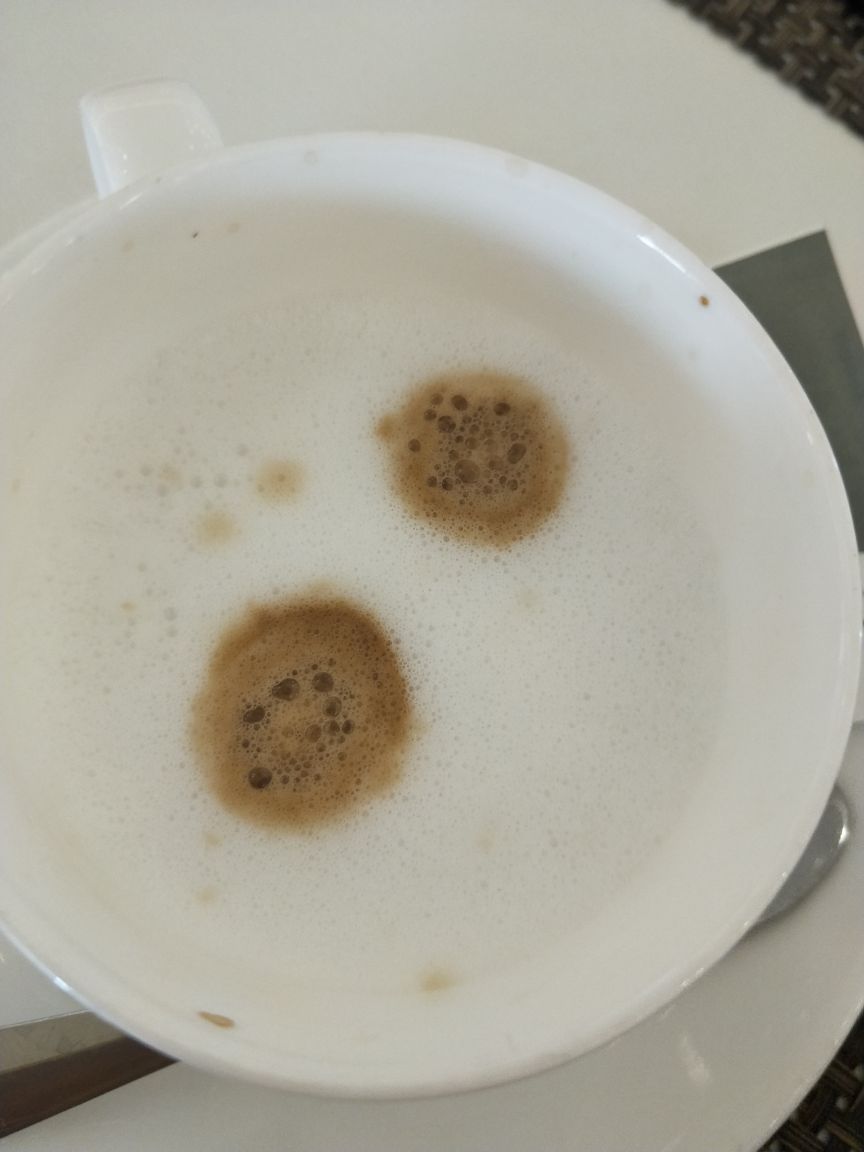 刚进去看到摆着有咖啡机,还没反应过来,刚想自己接咖啡呢,服务员就过来问我要不要喝咖啡?我说要,然后他问我要不要加牛奶,我说要,然后他就开始帮我做了。因为看着制成咖啡还要等一会儿,我就嘱咐服务员帮我放到桌子上,他欣然应允了。好贴心的服务啊。
