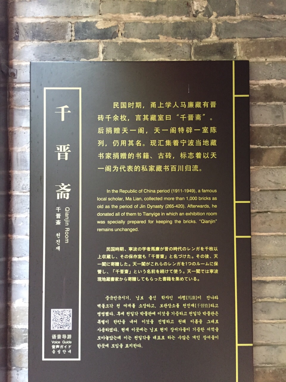 网友2018-09-29千晋斋之中藏书也颇为丰富,与尊经阁一起成为天一阁的主体,是参观天一阁必看的场所千晋斋因为其原主人藏有珍贵的晋砖一千余块而得名,后捐赠给天一阁博物馆,其名沿用至今。千晋斋之中藏书也颇为丰富,与尊经阁一起成为天一阁的主体,是参观天一阁必看的场所。